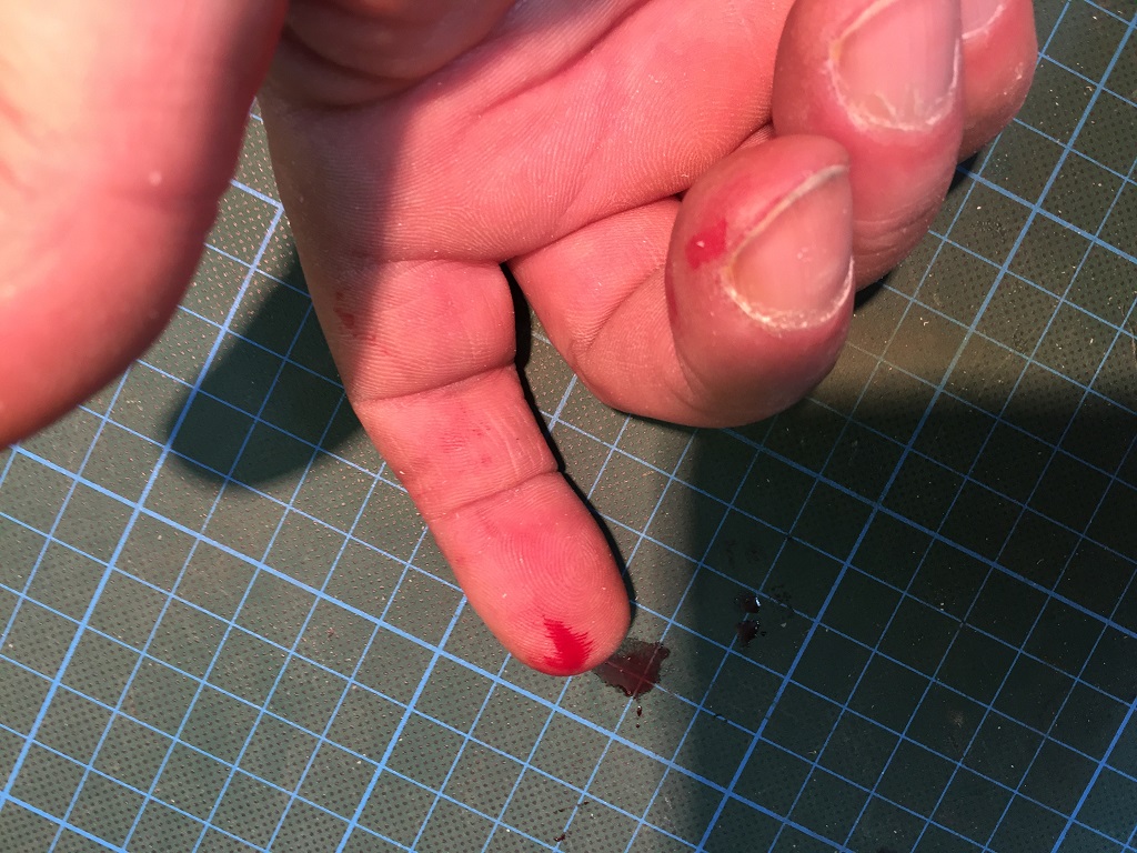 Die getrockneten Blutspritzer sind natürlich gut als Mahnung vorsichtiger zu arbeiten. Und CSI freut sich bei der Spurensicherung, falls Dir mal was ernsteres zustoßen sollte... :rolleyes: