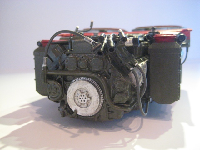 Wenn man die Kettenabdeckungen am Standmodell im Bereich der Traverse mit den Kühlern entfernt und durch 1mm Kunsstoff erstzt und die Schrauben für die Stossdämpfer etwas abfeilt passt der Motor in das Tamiya Standmodell.