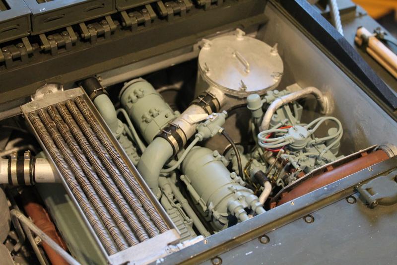 Geplant ist ein kompletter Ausbau vom Getriebe und Motorraum. Deshalb sitz auch der Antrieb unter dem Turm. Ein 1:25 Tamiya Modell mit Inneneinrichtung habe ich schon. Der Lautsprecher ist unter den Kühlern (noch nicht vorhanden) platziert. Die Lautstärke paßt für mich.