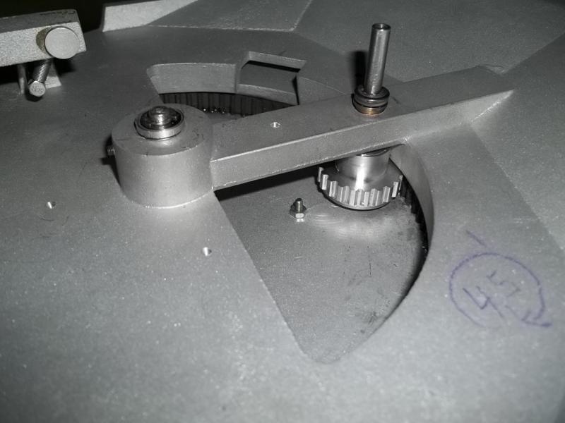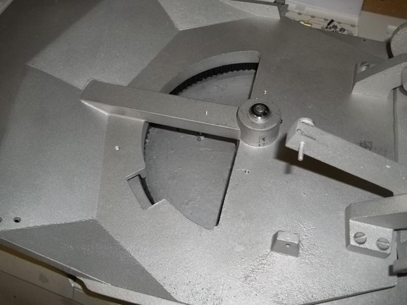 Hi so jetzt geht es weiter. Der Antrieb ist soweit fertig . Wie schon geschrieben sitzen die Getriebeblöcke auf Schienen so das der Riemen immer optimal gespannt ist. Der Turm ist mit Radial und Axial - Lager gelagert läuft wunderbar. Als Antrieb habe ich im inneren einen Zahnriemen eingeklebt . Der Antriebsmotor kommt in den Turm .Er wird dann mit einer Zahnriemenscheibe bestückt .