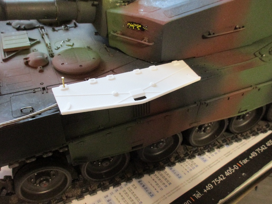 "Leichte Kettenschürze" für den Leo2 A4. Extra ohne die Anbindungen oben. Beim Tamiya Leo2 kann so das Schürzenteil weiter verwendet werden, die 2A6 Schürze abcutten, meine darunter. Feddisch.