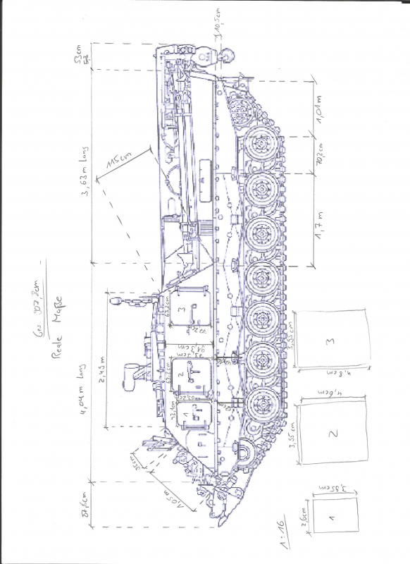 Anhand eines Großplanes eines Leopard 2 A4 habe ich die Maße für den Bergeleo ausgerechnet. Sie werden zwar nicht auf den Millimeter genau sein, aber für mich genügt es.