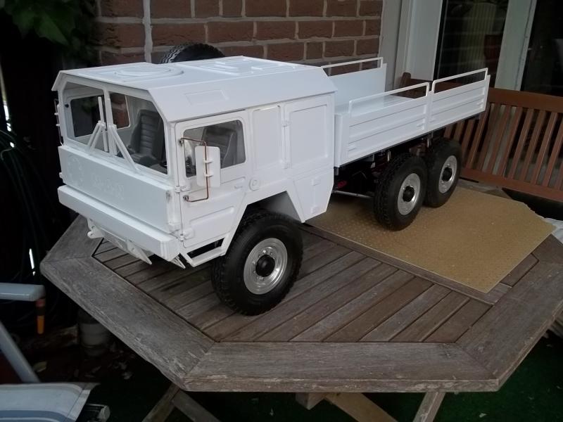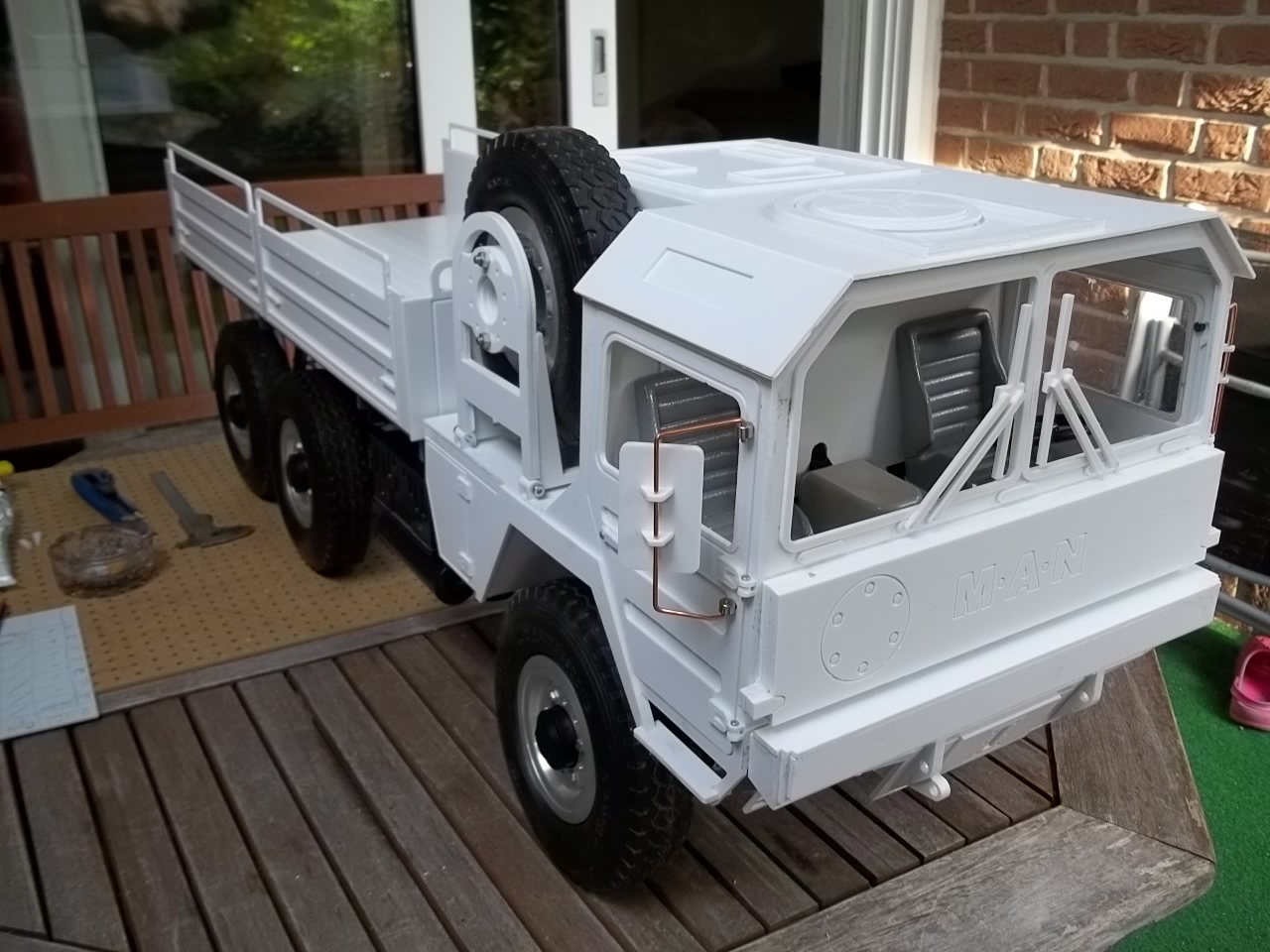 MAN Kat 1 an. Der Maßstab ist ca 1/7 - 1/8 Die Länge beträgt 1,10 m, Breite 30 cm. Gewicht ca 25-30 Kg. Alle Achsen angetrieben. Planetengetriebe an den Abgängen der Achsen. Die Vorderachse ist über ein Servo abschaltbar. Dreigang Schaltgetriebe,Servomotor PS-050 ca 90 Kg Stellkraft. Scooter Motor 12-24V. Reifen,180 mm Durchmesser, Alufelgen. Metallrahmen. Fahrtenregler Robbe Navy 540 -24V / 40 Amp. Hatte ihn zum Verkauf angeboten baue ihn aber jetzt selber weiter und behalte ihn.