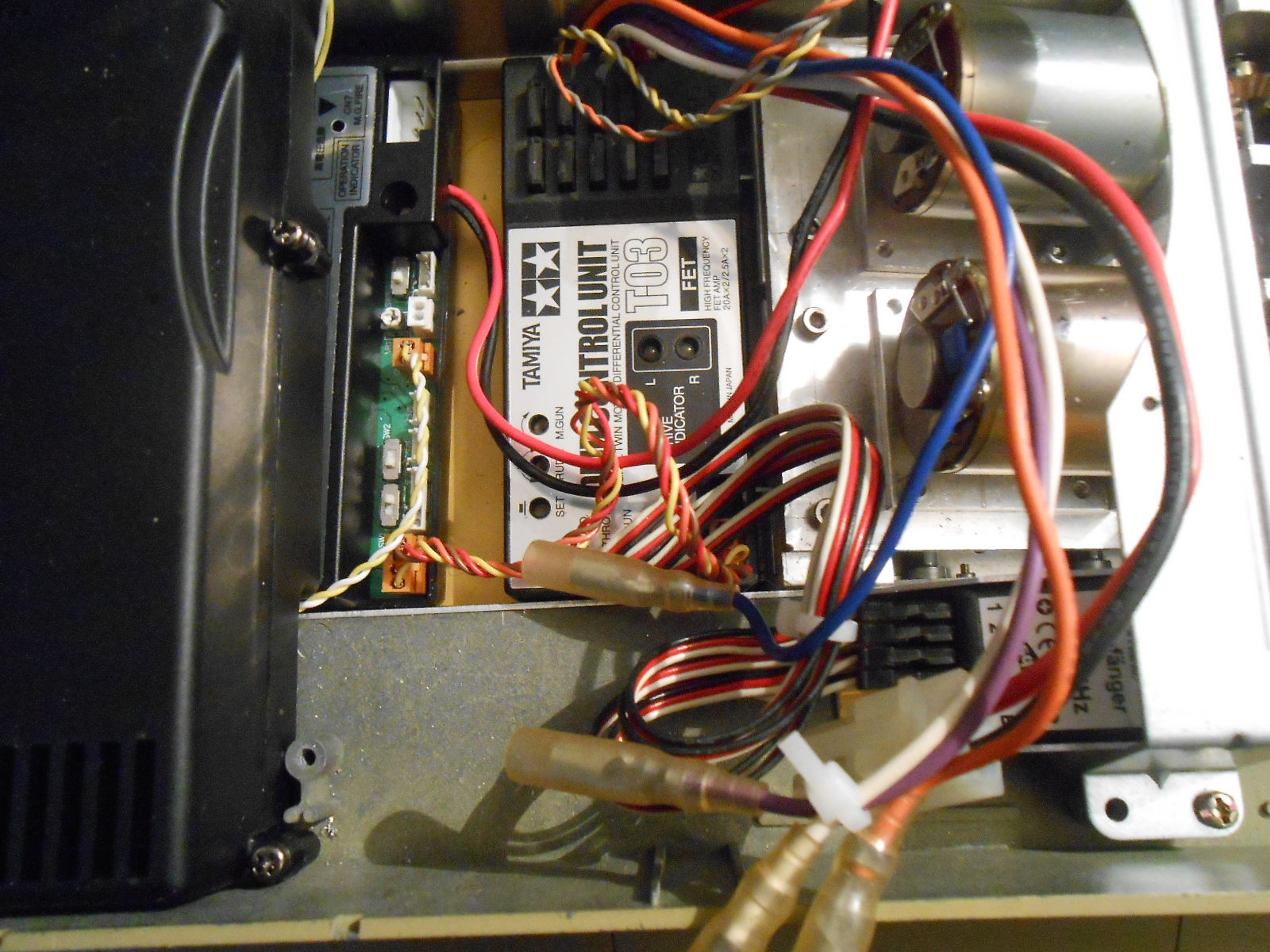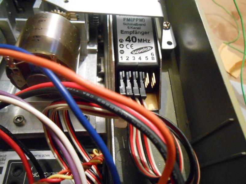 Da nun das neue Getriebe eingebaut ist müssen jetzt die RC Komponenten eingebaut werden was sich als nicht ganz einfach erwies. Das neue Getriebe hat deutlich mehr Platz eingenommen als das normale Tamiya Getriebe. Aber ich bin ein Tüftler der für alles eine Lösung findet. Gehen wir nach der Reihe durch als erstes habe über den Federstäben ein dünnes Alu Blech gelegt auf dem die MF und die DMD 03einheit unter der Lautsprecherbox eingebaut wurde . siehe Bild
