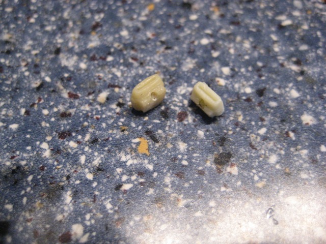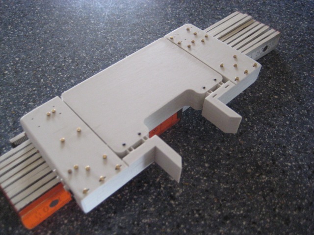 Schritt 1, verkleben der Frästeile mit Hilfe von Zenrtierstiften aus Messing und 1 mm Bohrern.