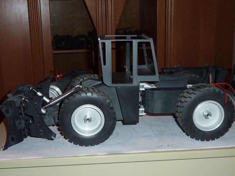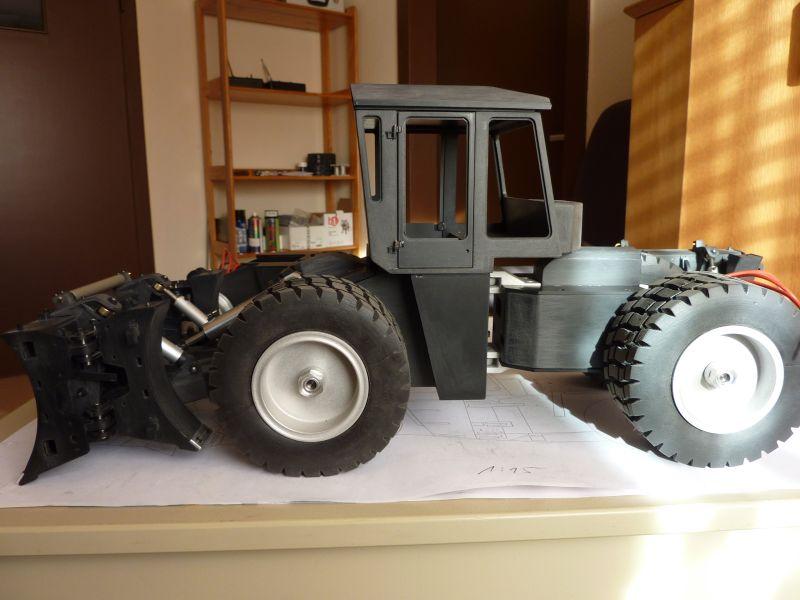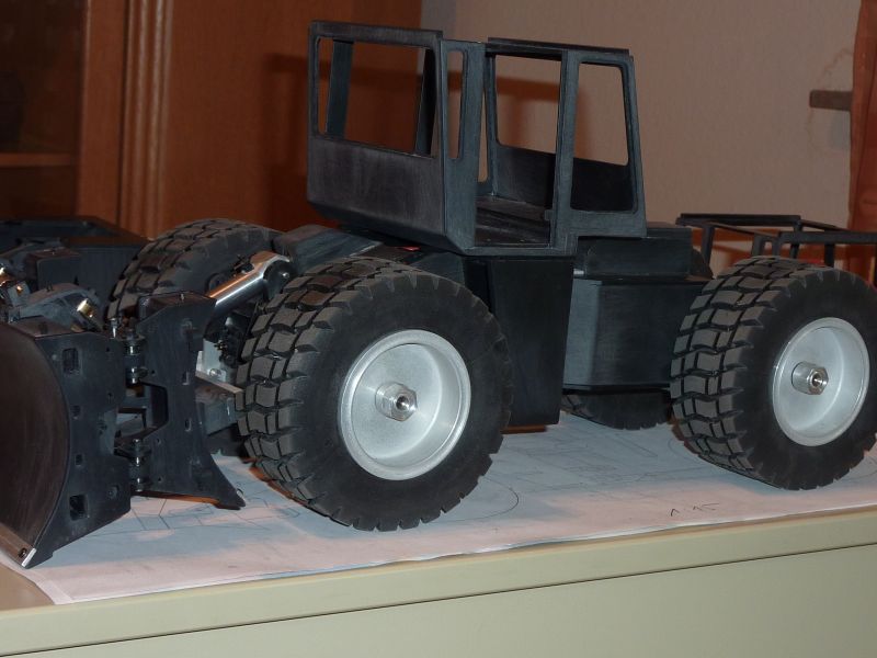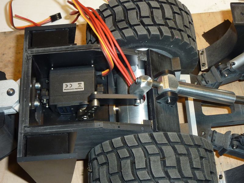 Nachdem ich die Servos wieder rausschmeissen mußte ( wer billig kauft ,kauft.... ) , war die ein oder andere Änderung fällig , die neuen Savöx Servos bauen 5 mm höher . Aber jetzt klappt es mit dem Räumschild einwandfrei und ich werde die Servos auch für die Lenkung einsetzen, 16 kg sollten reichen .