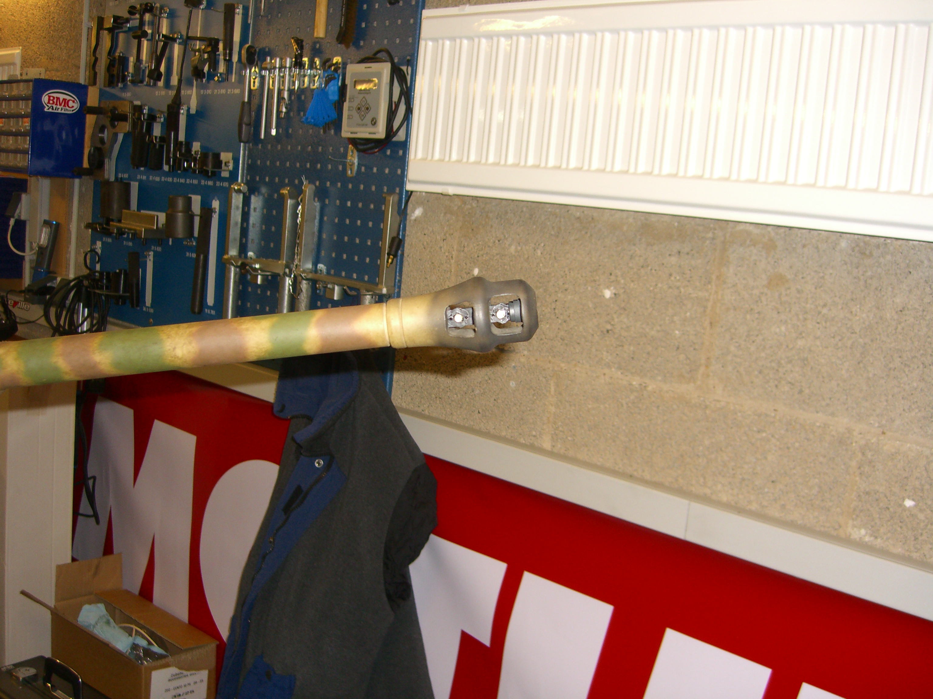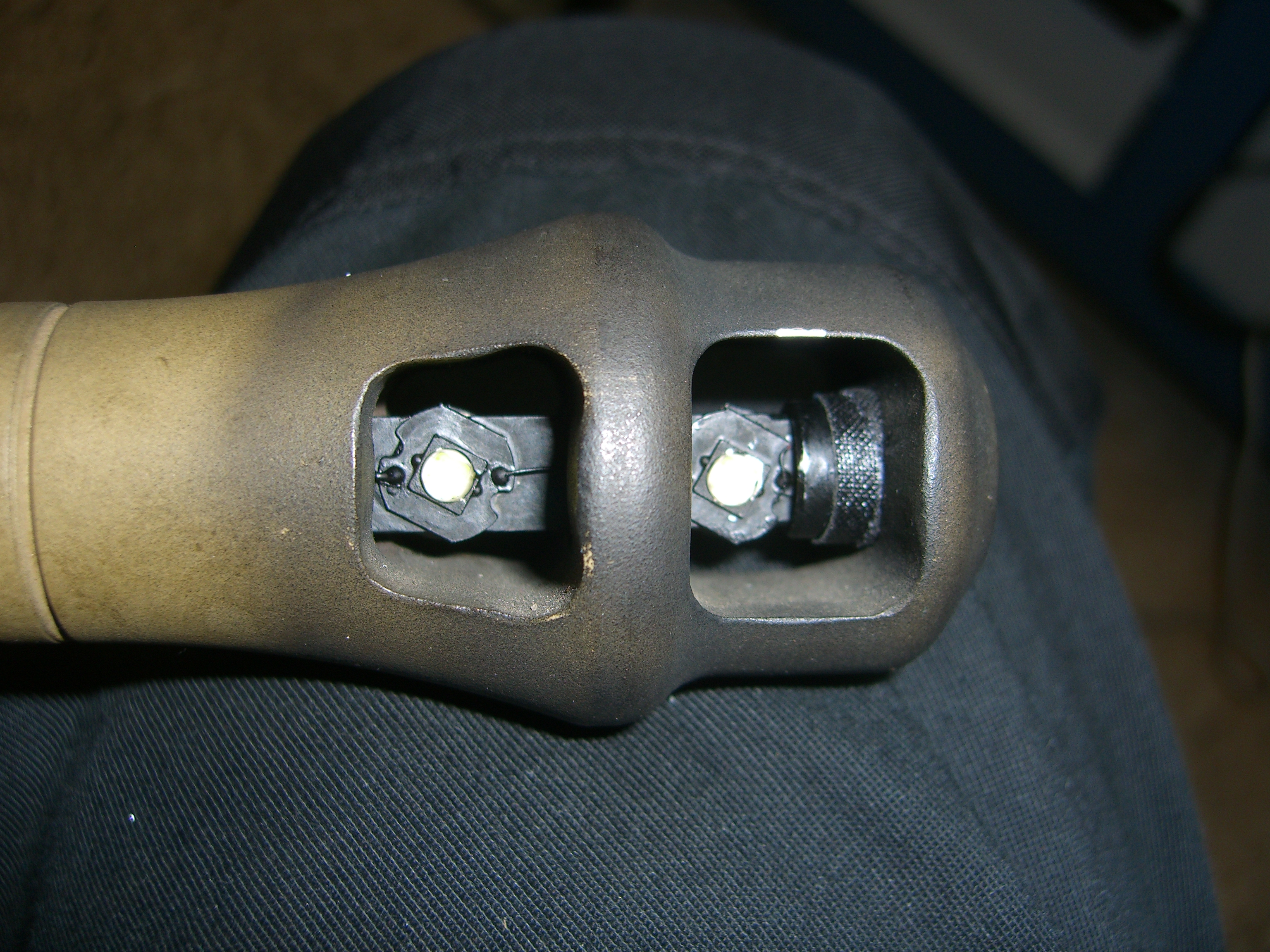 Ich könnte mir vorstellen, dass die Dioden weniger auffielen, wenn sie nicht zentral in der Mündungsbremse, sondern seitlich angebracht wären. Also auf einem gabelförmigen Träger, mit den Rückseiten zu den Stegen, die Abstrahlflächen wiesen nach innen. Ist natürlich nicht ganz so einfach und universell zu fertigen wie der stabförmige Träger von Benedini.