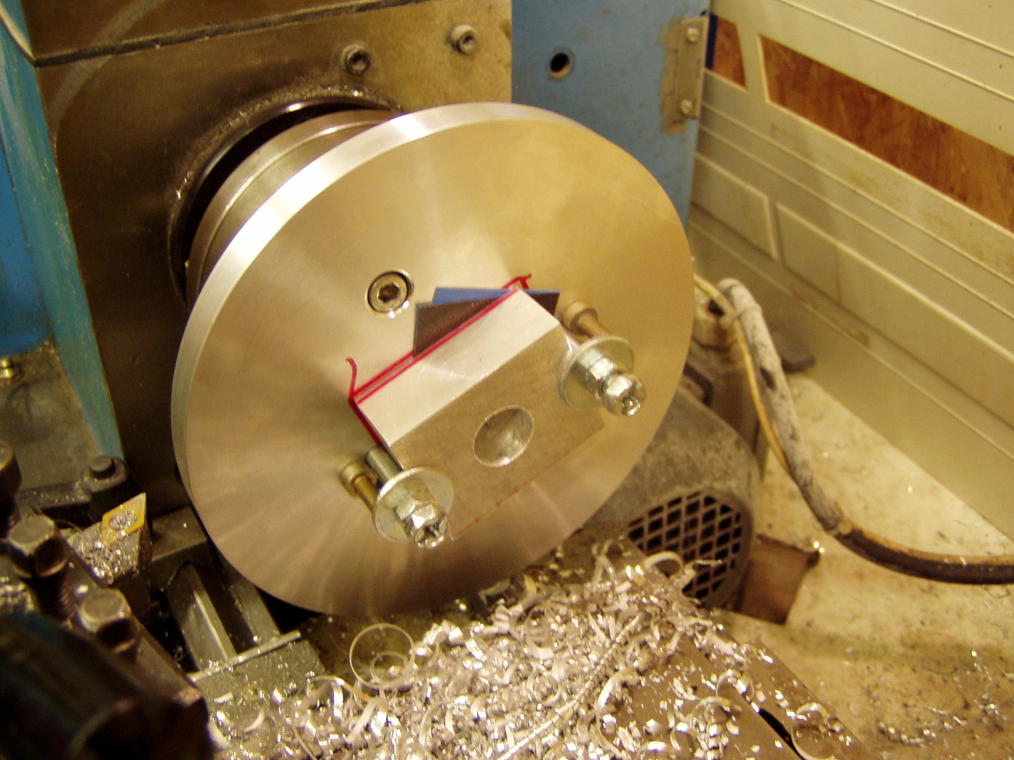 Herstellung Festlager für Spindel auf selbstgefertigter Planscheibe auf der Drehmaschine.