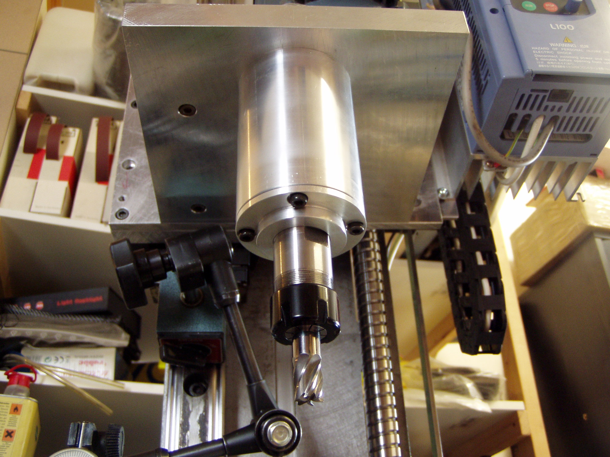Als Antrieb der Spindel dient ein 0,55 kW Drehstrommotor. Übersetzung per Zahnriemen von 1:2/1:1/2:1 verstellbar. Regelung über Frequenzumrichter von 0-15.000 U/min. Frässpindel ist Eigenbau, Grundlage eine ER 16 aus der Bucht, Spannzangen von 1-16mm. Rundlauf? Naja, eben fürs Hobby ausreichend.