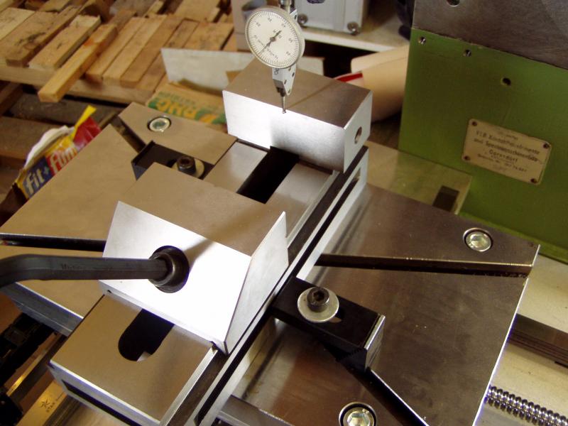 Niederzugspanner Wabeco, Spannbereich ca. 150mm, Backenhöhe 40mm, wird auf dem Tisch ausgerichtet. Es folgte noch ein Rundtisch links daneben, der Schraubstock wurde ganz nach rechts verschoben. Aufgrund des großen Verfahrweges können beide aufgespannt bleiben.