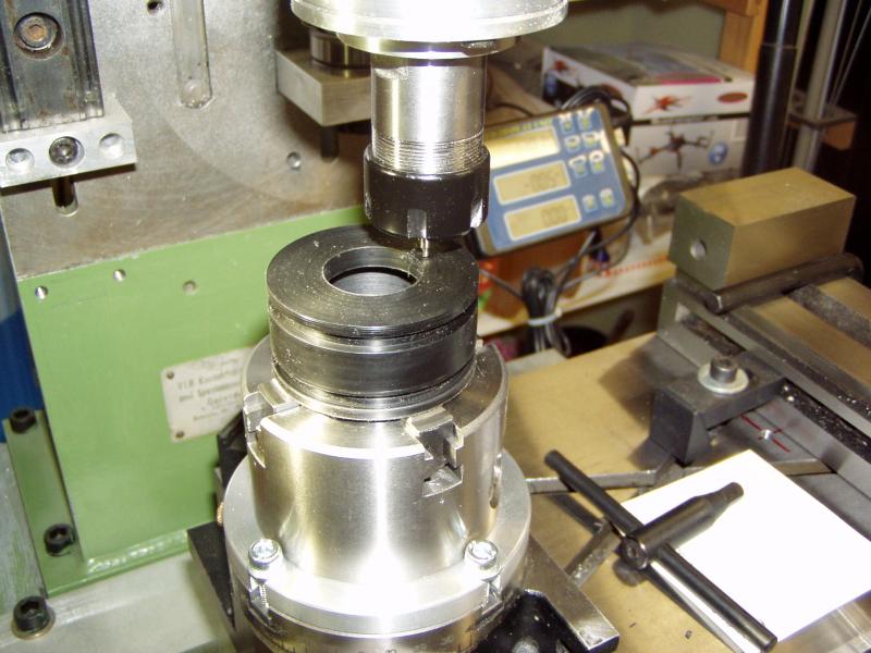 Die Einrichtung Mitte Spindel/Teilkopf mache ich wie folgt: In beide je einen Zylinderstift gleichen Durchmessers spannen, grob deckungsgleich einrichten. Geschliffene Parallelunterlage(Leiste) seitlich zuerst in X anlegen, Lampe dahinter, verfahren, bis gleichmäßiger Lichtspalt sichtbar und nix mehr kippelt, nullen am Display. Das Gleiche in Y. Max. 2 mal wiederholt, und Mitte stimmt auf ca. 0,01mm. Meine Methode. Mache ich auch so an Werkstückkante oder fester Backe des Niederzugspanners. -- Ein Tag ohne Modellbau ist ein Verlorener...