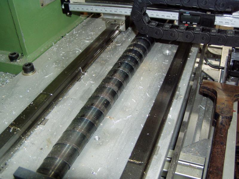 Im Idealfall werden diese Schienen in einer vorgefrästen Nut verbaut und mit Excenterschrauben an eine Wand der Nut angepresst. In meinem Fall erfolgte die Befestigung mit M6-Schrauben aller ca. 50mm, wobei an jeder Schraube Fühlerlehrenblech von 0,02-0,2 mm in verschiedenen Kombinationen beigelegt wurde, um den Verzug auszugleichen. Die Schienen waren hundekrumm, da nicht neu. Abgefahren mit einem Feinzeiger(Taster) ergibt sich eine Genauigkeit von rund 0,02mm auf 400mm.