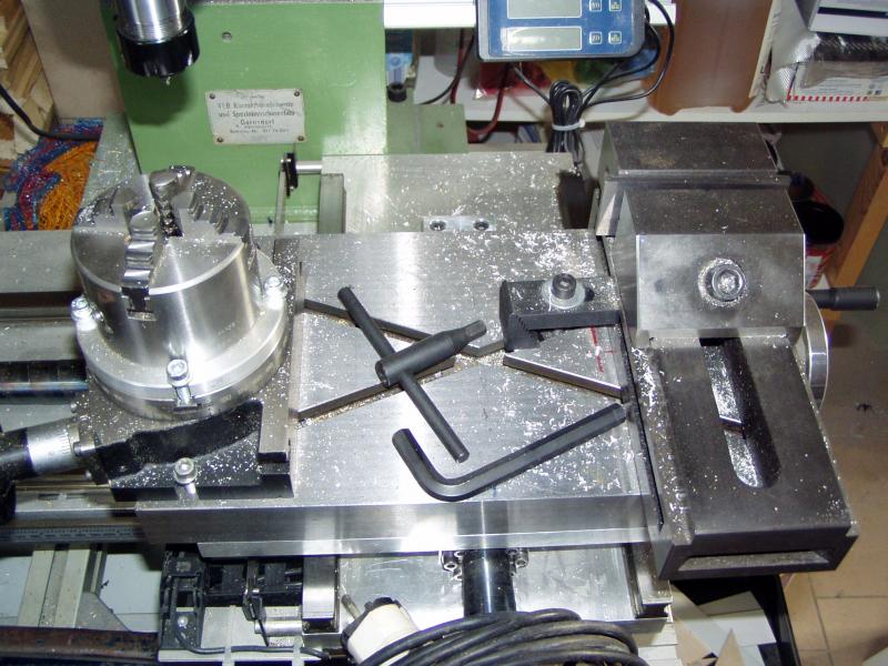 Momentaner Zustand auf dem Tisch: Rechts Niederzugspanner, links einfacher Teilkopf von Wabeco, nur mit Gradanzeige. Rundlauf etwa 0,05-0,08mm, reicht für meine Zwecke. Achtung: Immer nur in eine Richtung drehen... -- Ein Tag ohne Modellbau ist ein Verlorener...