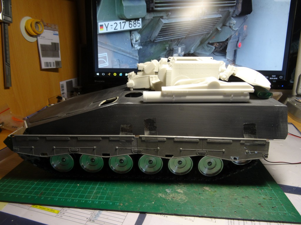Die Kettenschürzen am Modell sind nur mit Tesa fest, um zu sehen ob alles Passt.
