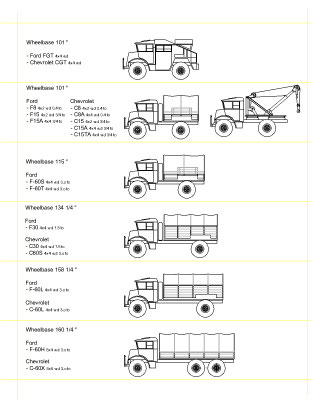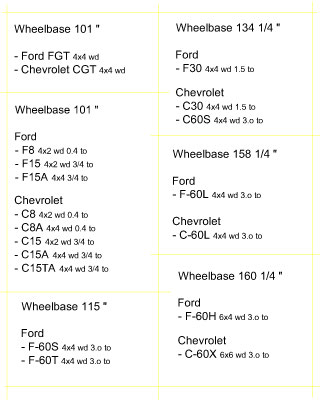 Ich hab zur besseren Verdeutlichung eine Typenübersicht angefügt. Es gab aber auch Abschlepper mit 101 und mit 134 Zoll Rahmen, der kurze mit einfachem Kranarm, der längere mit doppeltem, so wie bei "Ward la France"-Wrecker z.B.