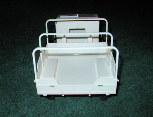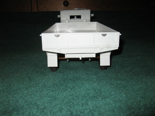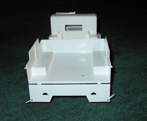 Der Staukasten mit Ersatzradhalter ist einmal seitlich hoch zur Unterbringung kleiner Fahrtregler und Empfänger ausgelegt, mit kleinem Kasten für die Stand/Vitrinenmodelle gedacht . Der hohe Kasten entspricht allerdings nicht der Originalvorlage, aber was soll´s ....