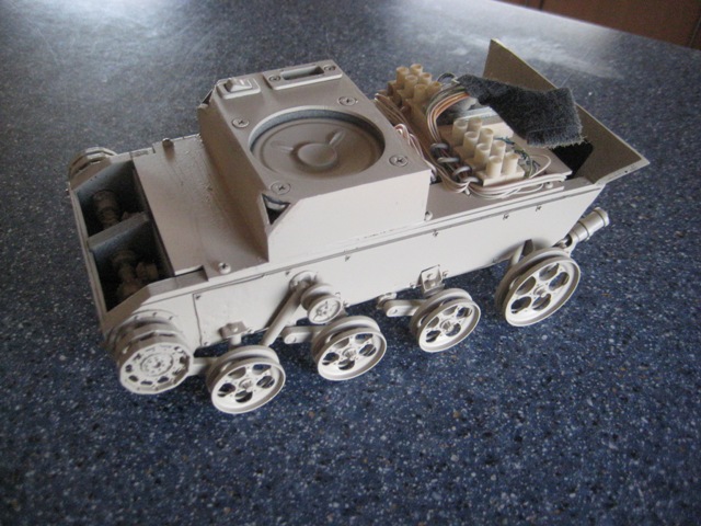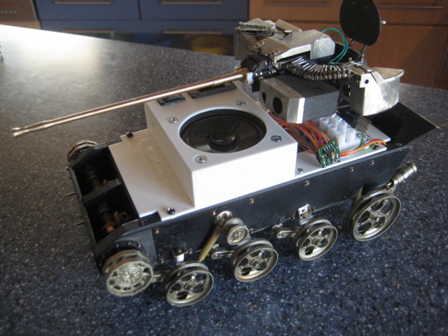 Wenn der Gerhard nicht so verschwenderisch mit dem Platz umgehen würde, dann hätte er den Kampfraum auch ausbauen können. Getriebe, Akku, Soundmodul und Empfänger würden leicht im Motorraum Platz finden.