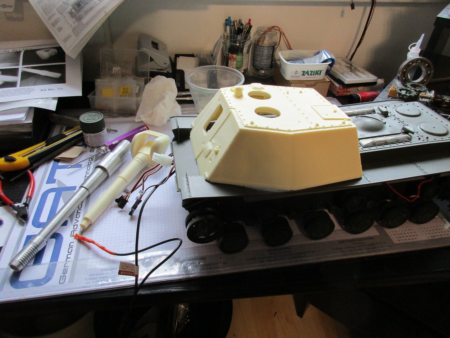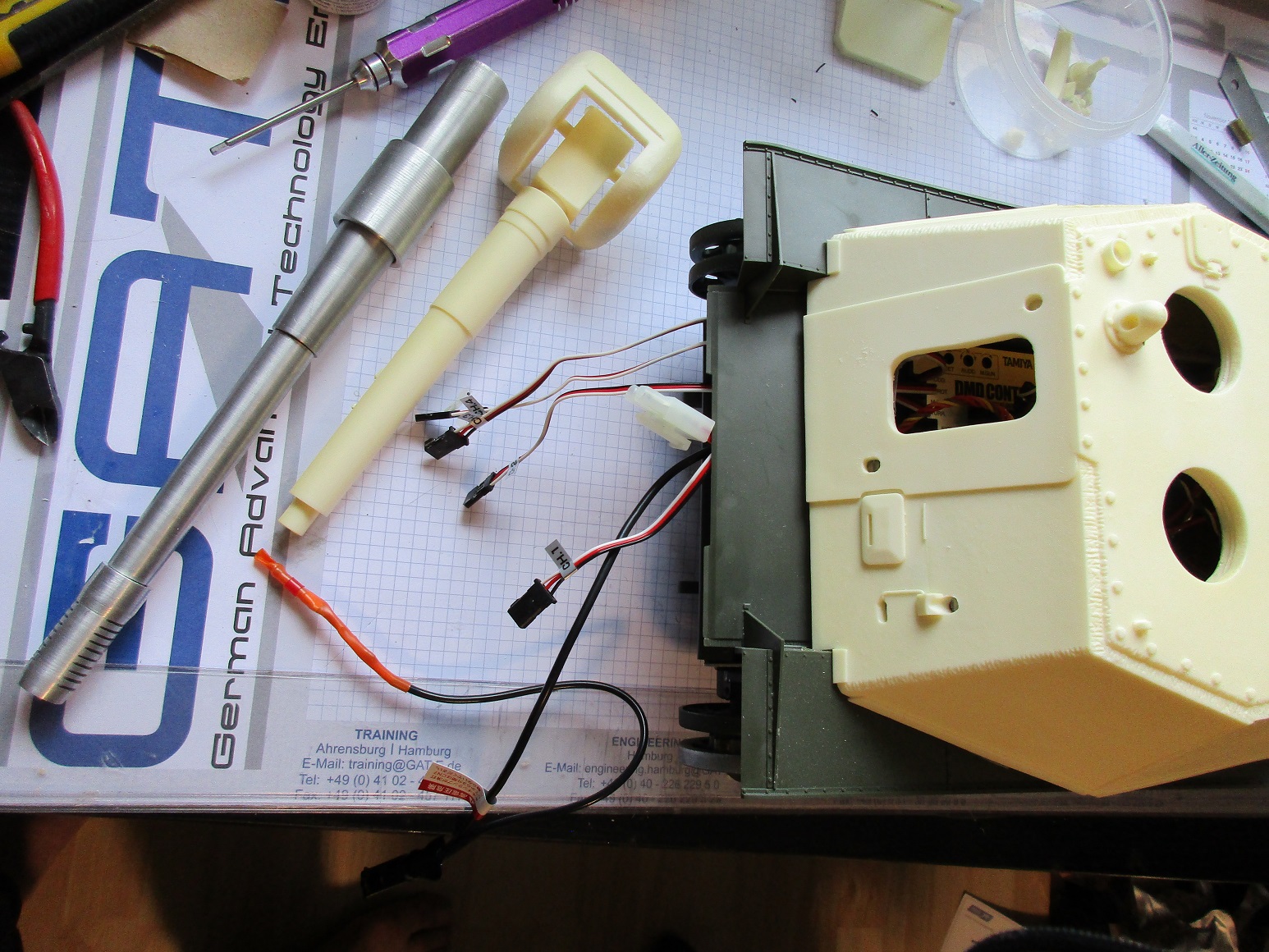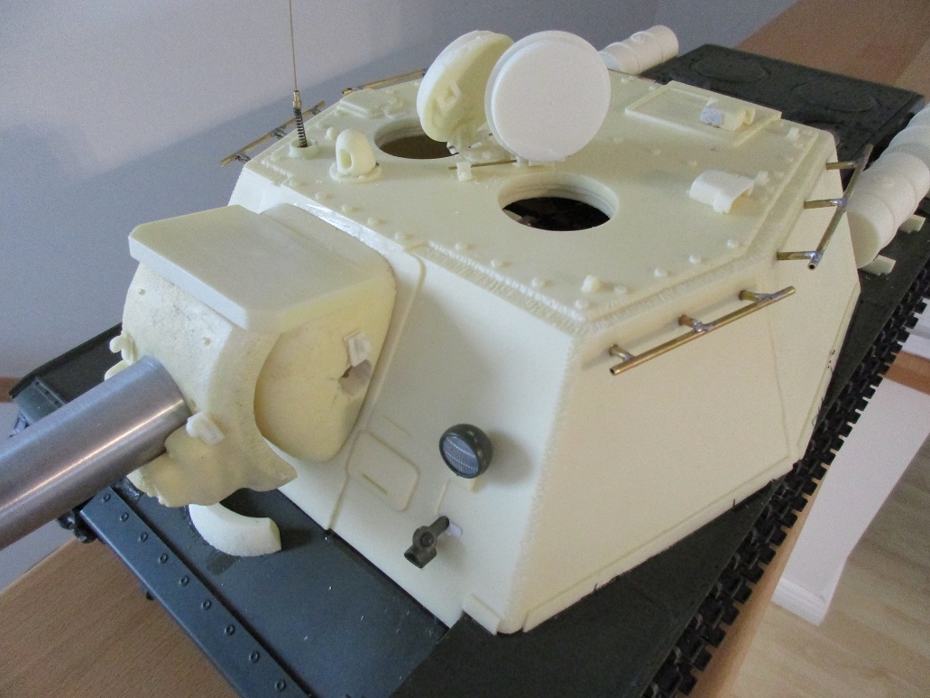 Hier gab es entscheidende Fortschritte. Gestern den ganzen Tag gefummelt und den Tamiya KW Rohrerhönhung/- rückzug integriert. Funktioniert wie es soll! Dazu die Blitzeinheit ins Rohr- gewaltiger Aufzug das ganze!