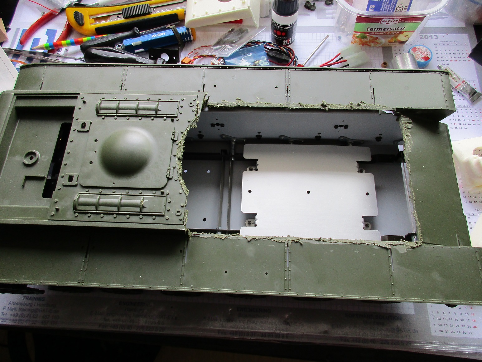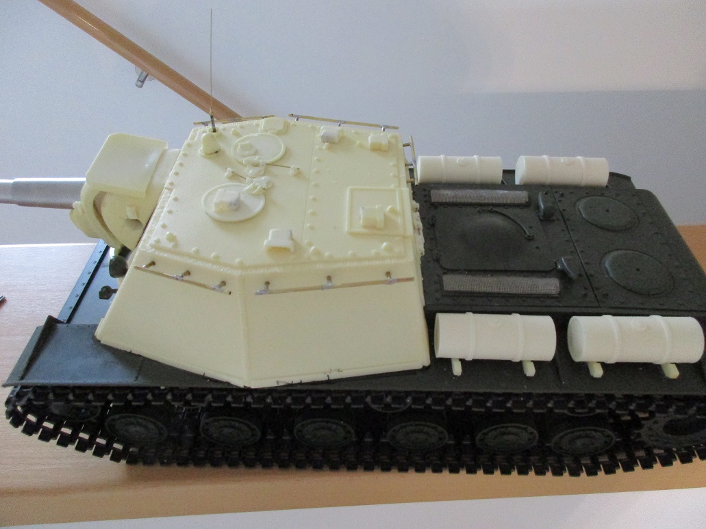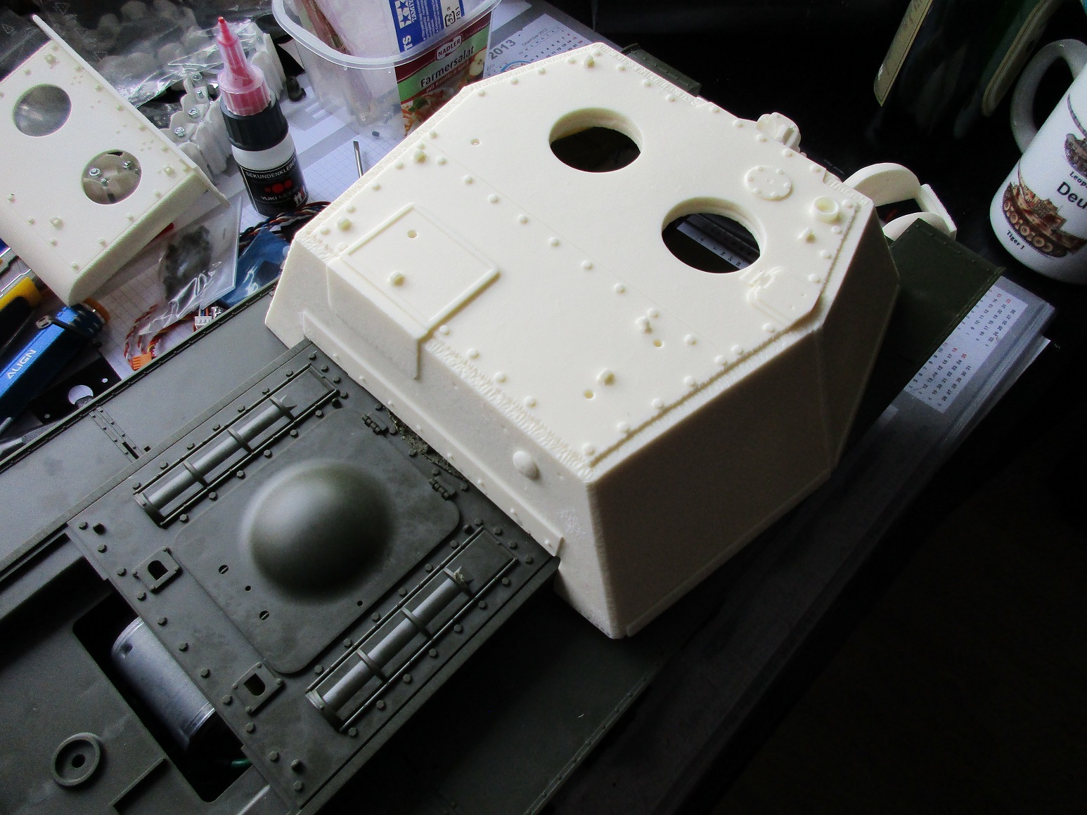 Dann wurde die Oberwanne aufgetrennt. Aktuell passe ich den Juckenburg Aufbau ein und es geht an die Feinarbeiten. Ach so, ein paar schicke Teile von \\\"Aber\\\" hab ich mir auch gegönnt. Bisher wurde das Leitblech an der Unterwanne hinten oben statt des wenig filigranen Tamiya Teils ersetzt.