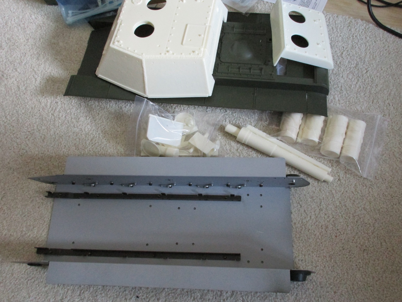 Mittlerweile ist die Unterwanne in bewährter Tamiya Qualität gebaut und lackiert. Dazu möchte ich folgendes anmerken: der \\\"Kettenspanner\\\" ist jämmerlich. Und beachten- die Schwingarme sind so einzubauen, das die Bohrungen/ Gewinde für die Madenschrauben nauch UNTEN zeigen, das erleichtert das verschrauben der Achsen der Laufrollen!