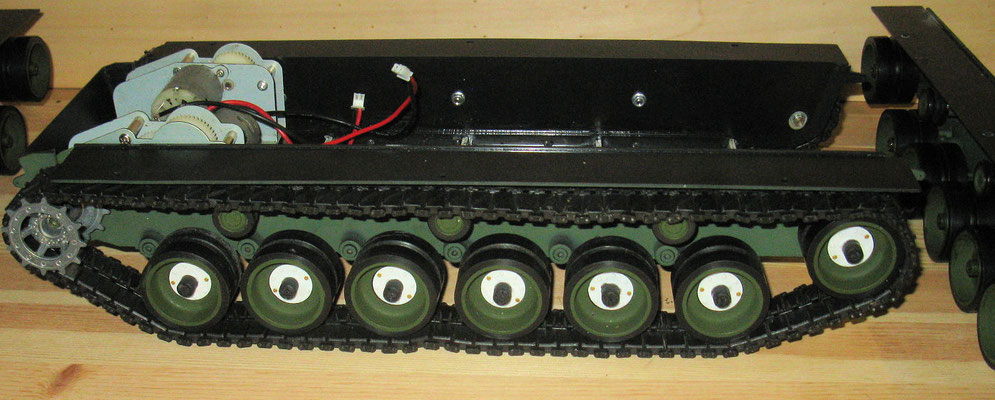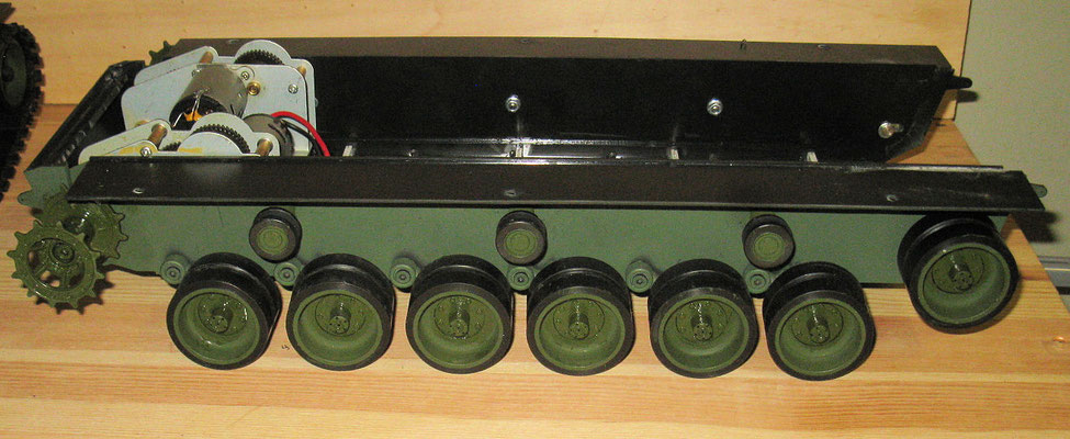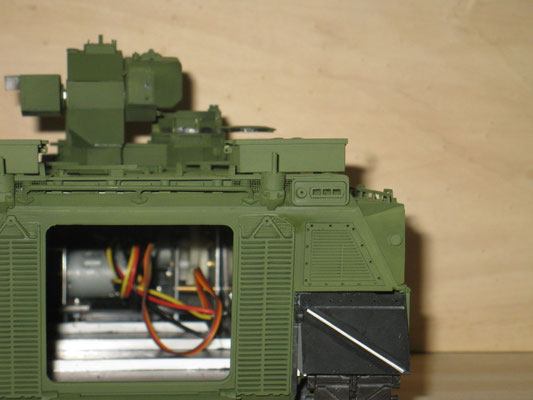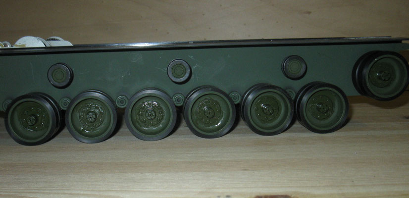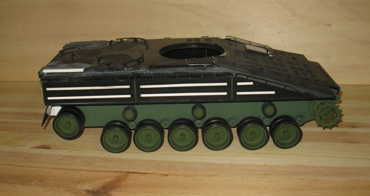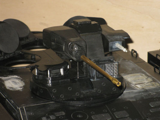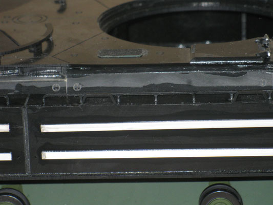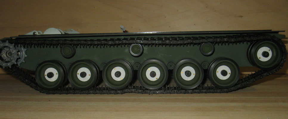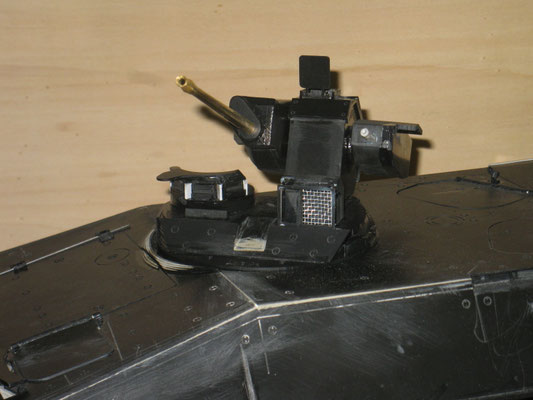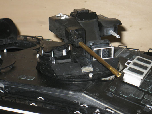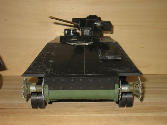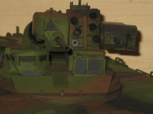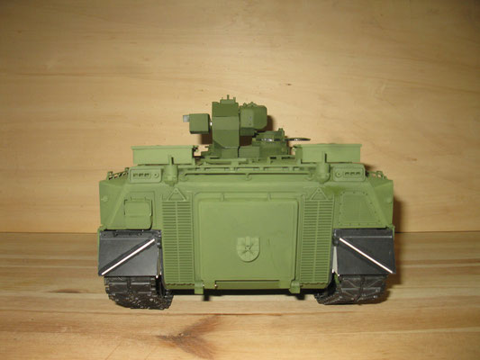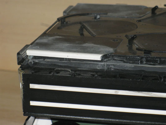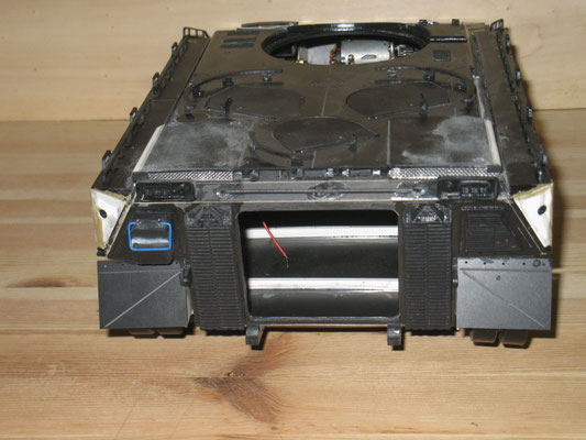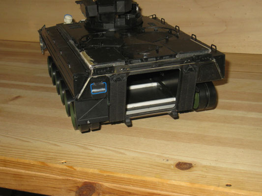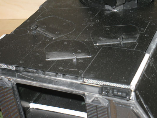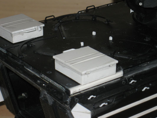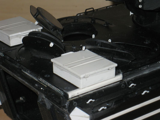 ... und wieder ein Stück weiter. Die einzelnen Segmente der Kettenschürzen sind einzeln aufklappbar. Die Staukisten sind allerdings nur Dummys, nicht zum Öffnen gedacht. Zurrösen an den Wannenstaukästen und Hebehaken am Turm sind ebenfalls jetzt am Platz.