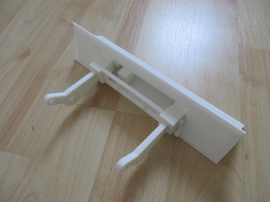 Das Stützschild besteht aus zwei Teilen. Nachdem die Aufnahme/ Arme in das Gehäuse des Schildes eingesetzt sind können diese mit Messingrohren drehbar gelagert werden. Ein "Drehstab" aus Federstahl sorgt für das Fixieren. Stützt das Schild kann es sich dem Boden anpassen "hindrehen". Wie im Original.