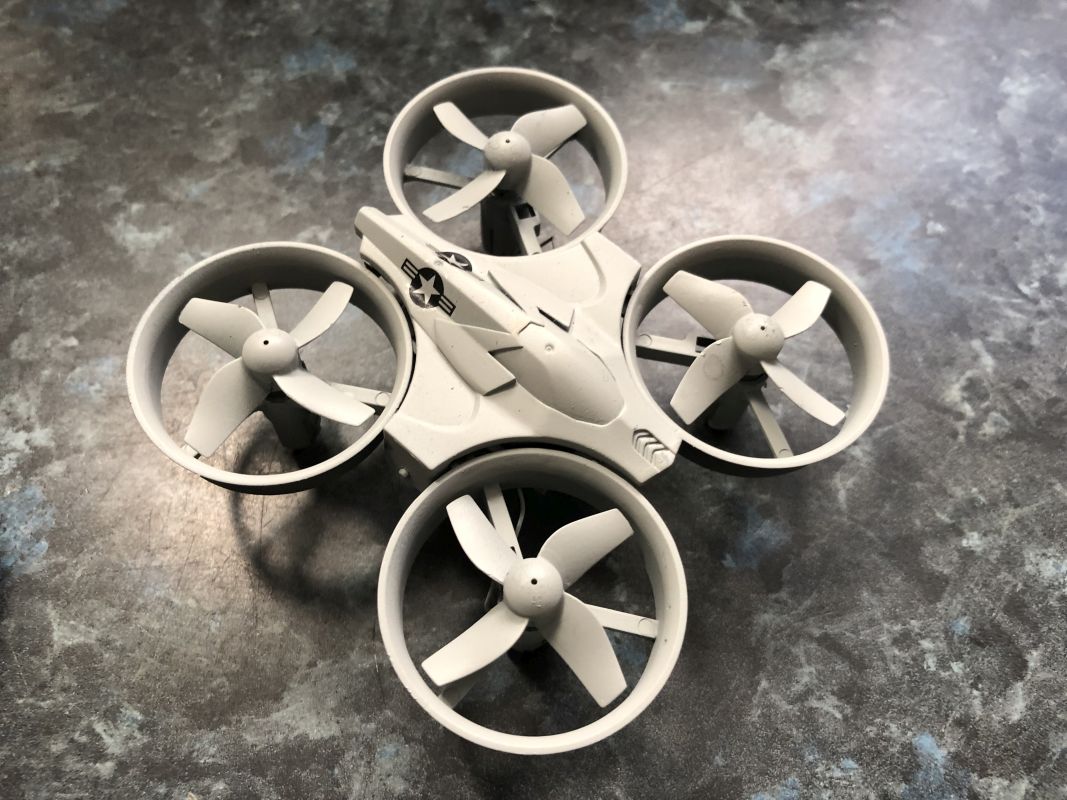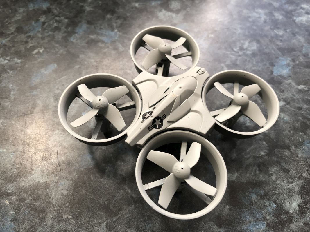 Basis ist die Drohne von JJR/C H36. Kostet ca. 20€ in der Bucht. Dazu kam dann die Farbe - deshalb meine Anfrage in der Suche vor ca. 2 Wochen und dann noch 1/72er Decals.