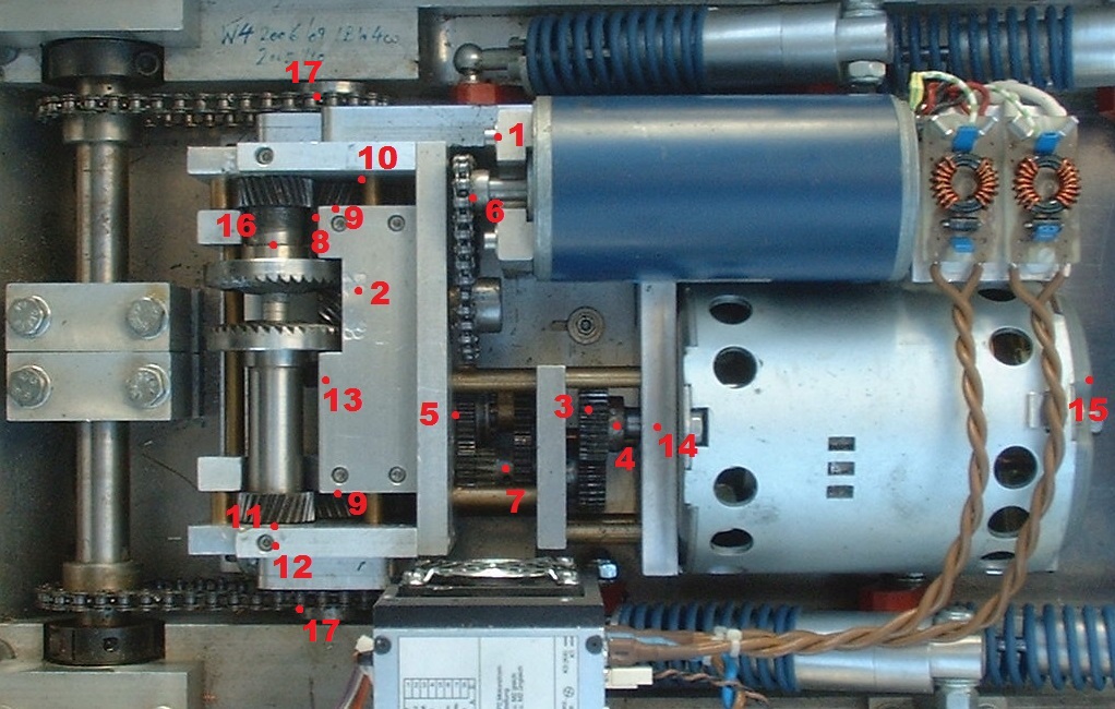 Nach ca. fünf Runden im Garten wurde das Modell langsamer und wollte trotz vollgas nicht mehr so richtig vorwärts. Eine Vorab-Analyse zeigte, dass die Linke Kettenseite irgentwie blockierte. Um das Modell mit der "Notfernsteuerung" wieder in die Garage zu ziehen, mußte erst die Übertragungsketten (Punkt 17) getrennt werden. Leider mußte dann zur genaueren Analyse das Gertiebe ausgebaut und diesmal komplett zerlegt werden.