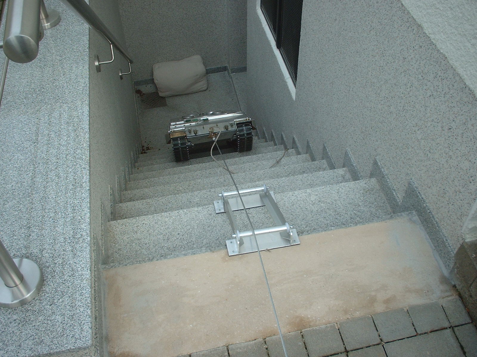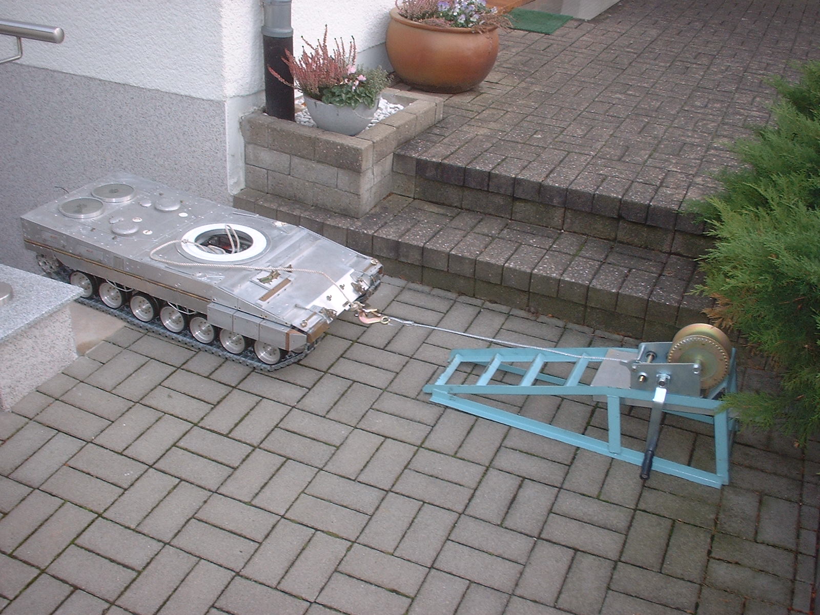 Es wurde eine 1100 kg Seilwinde für sagenhafte 34,- Euro angeschaft, auf eine Stütze montiert, die ich zufälligerweise noch in der Garage hatte. Das Ganze wurde an einem stabilen Mäuerchen des Blumenbeetes verankert. Zusätzlich gab es noch zwei Rollen als Kantenschutz für die Treppe.