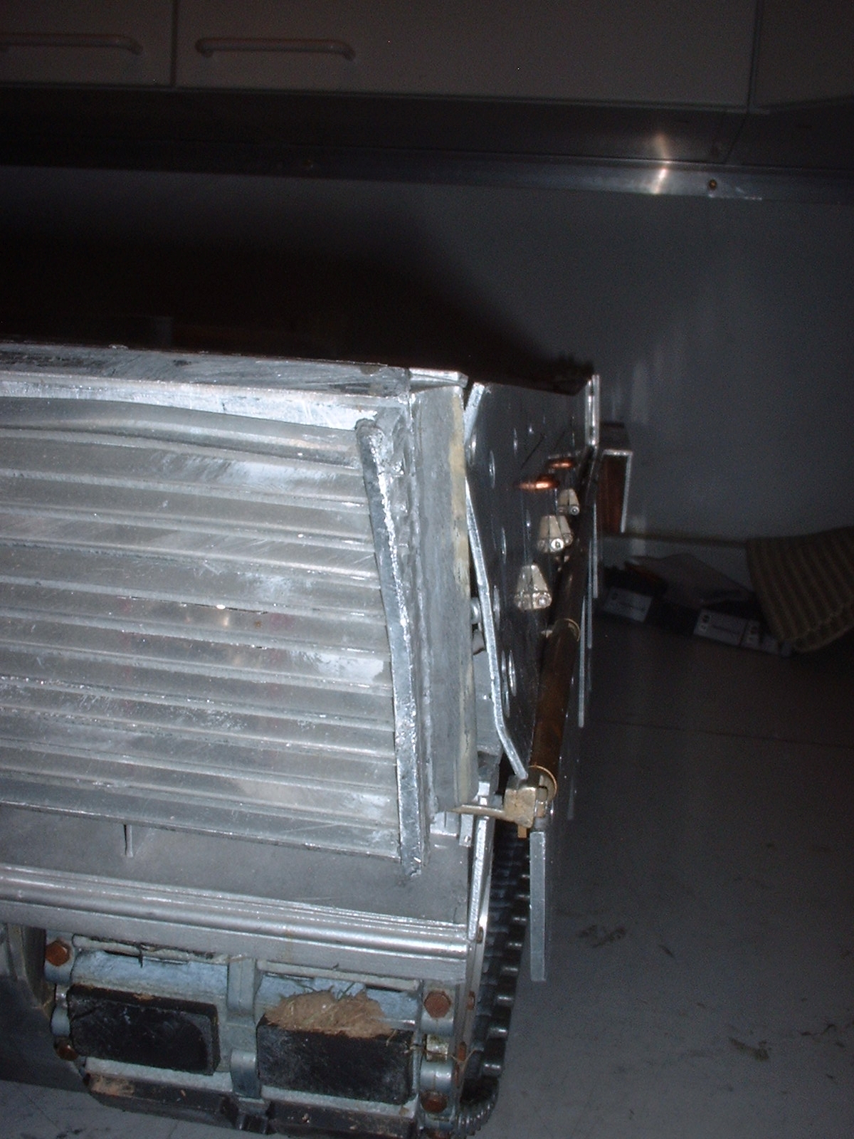 Die Unterwanne hat dank des guten Fahrwerkes den Absturz recht schadlos überstanden. Lediglich eine Stützrolle ist abgebrochen. Warscheinlich, weil eine der Laufrollen von unten dagegen geschlagen ist.