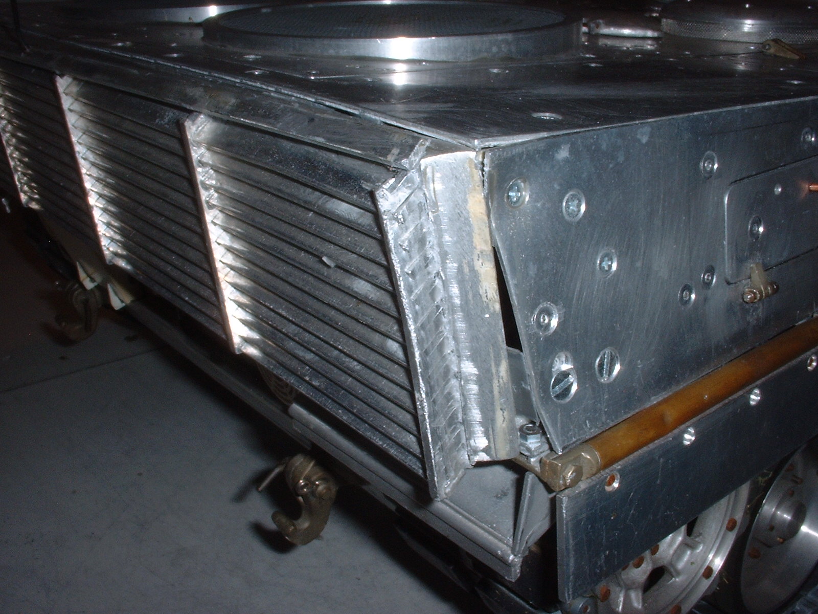 Die Platte der Lüftungsgitter hat es zum Teil aus der Verankerung herausgerissen, weshalb jetzt auf der linken Seite ein großer Spalt zwischen Lüftungsgitter und Seitenpanzerung klafft.