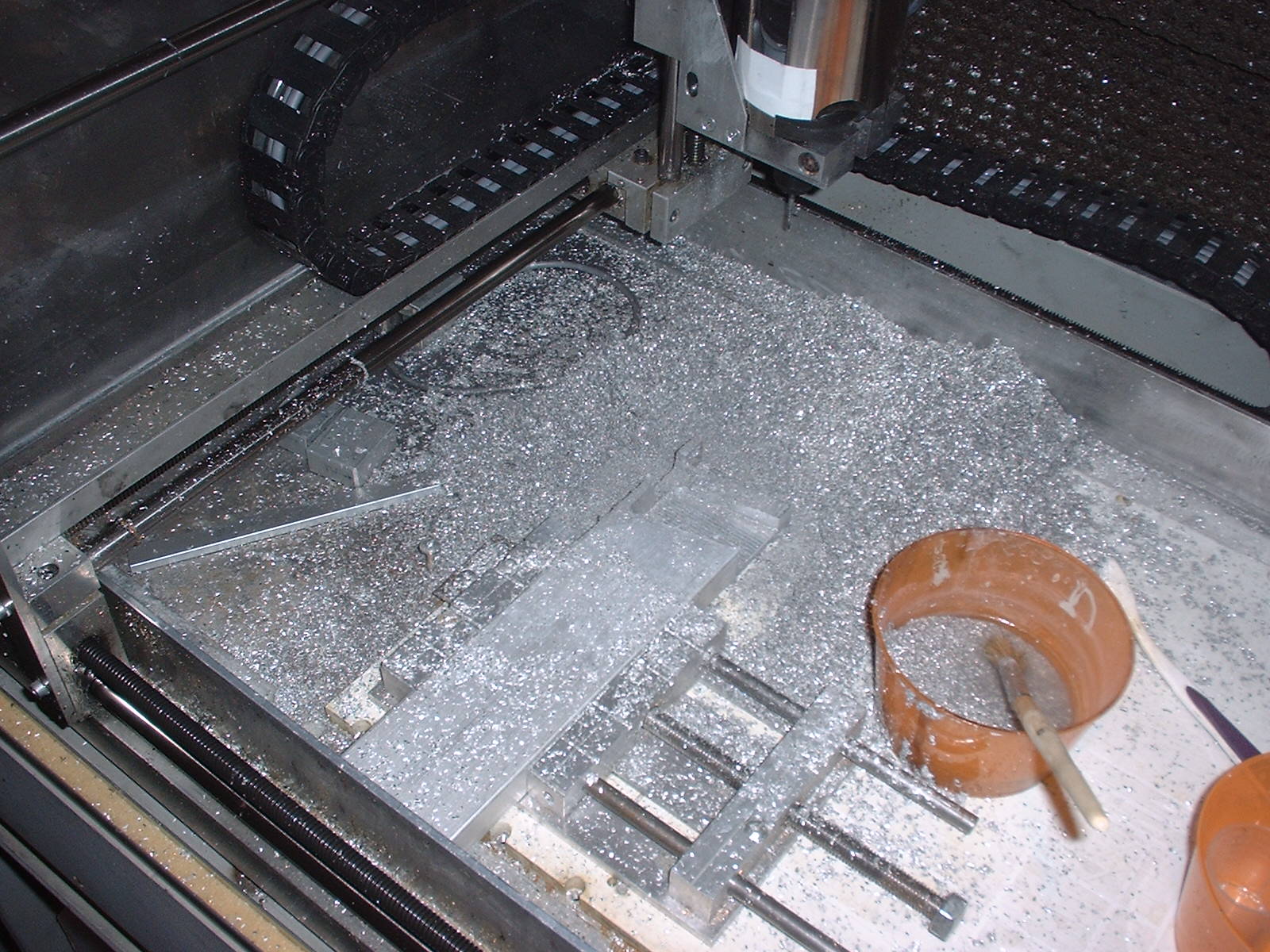 Hier, in der Mitte des großen Haufen Alu-Späne, kaum zu erkennen einer der Eckwinkel nach dem Fräsen der ersten Seite.