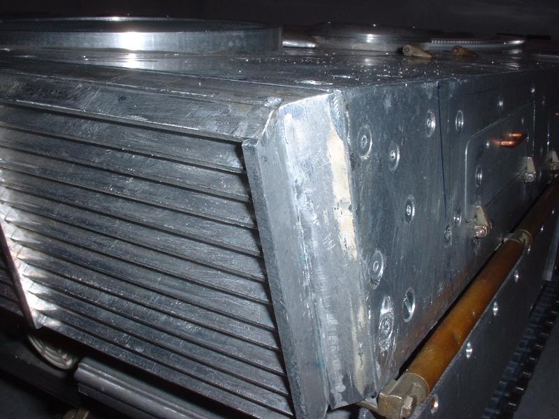 Die ganzen verbogenen Bleche, besonders am Heck sind nach dem Dengeln wieder erstaunlich gerade geworden. Was jetzt noch an Beulen und Befestigungslöchern vorhanden ist, wird später vor dem Lackieren mit 2K-Spachtel geglättet. Auch der seitliche Befestigungssteg für das Lüftungsgitter am Heck ist durch ein neues CNC-Teil ersetzt.