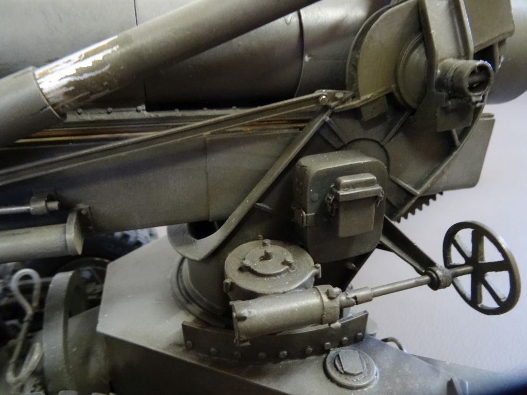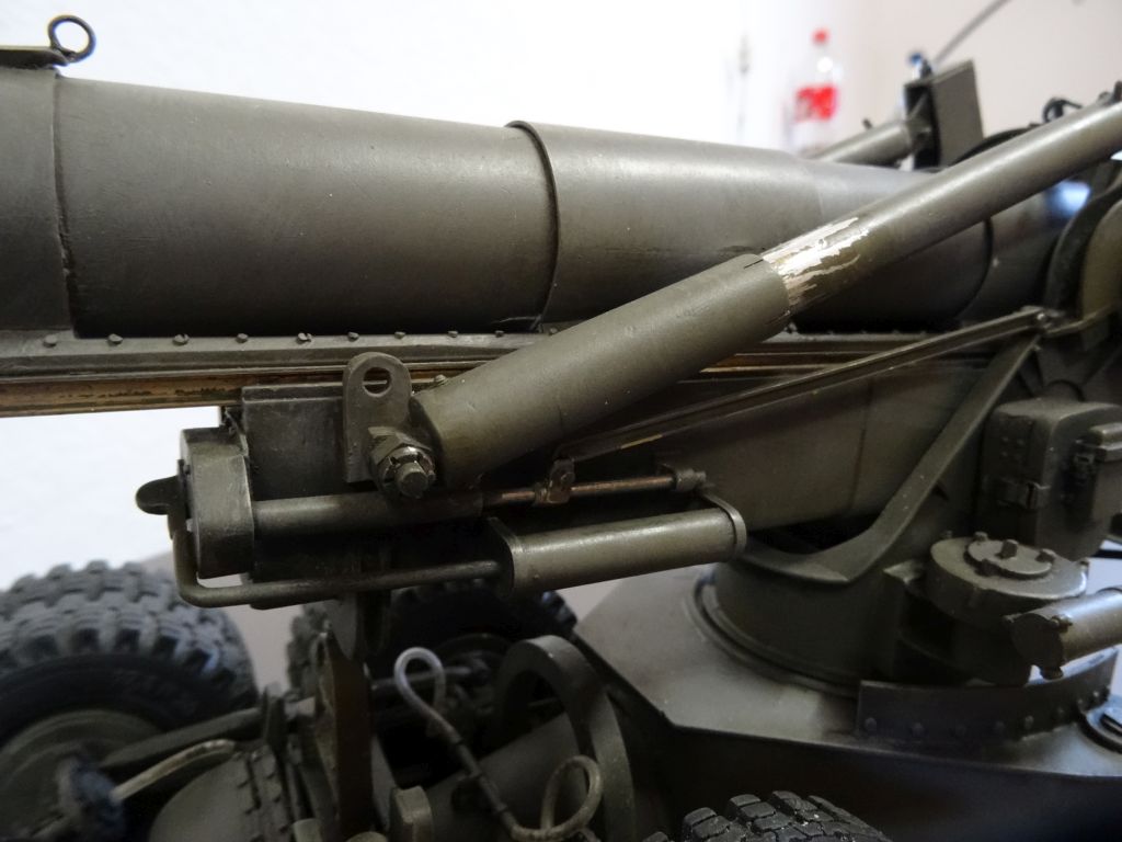 von links hinten mit Seitenrichtgetriebe ,-Bedienung. Hier kann man an der Rohrwiege auch das Verstellgestänge ( das Messingprofil , das schräg nach vorne und nach unten läuft und einen Schieber auf der Stange des runden Gehäuses betätigt ) das beim Original den Rohrrückzug je nach Erhöhung reguliert .