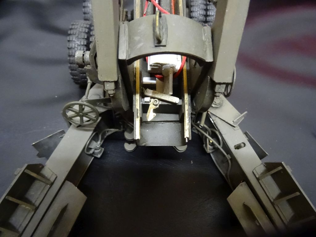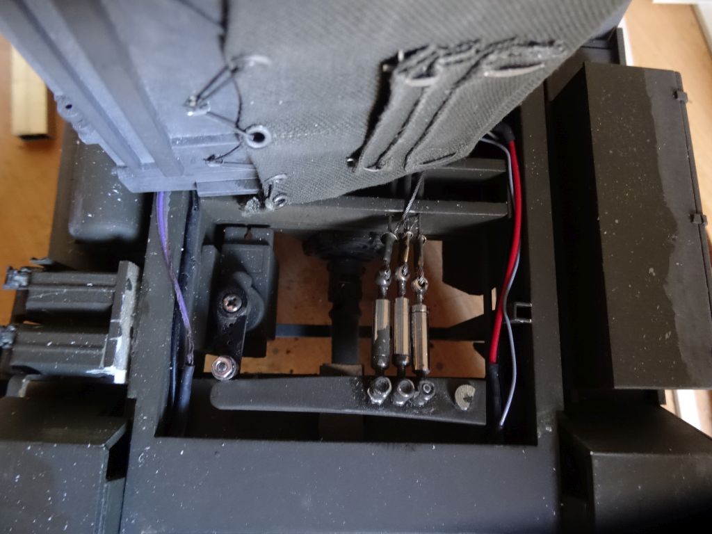 Hierzu hat die Long Tom am Holm einen Steckeranschluß zur 12 Volt Versorgung , in dem rechten Holm sitzen die Fahrregler für die Lafette , das Höhenrichten und für den Antrieb des Rückzuges .