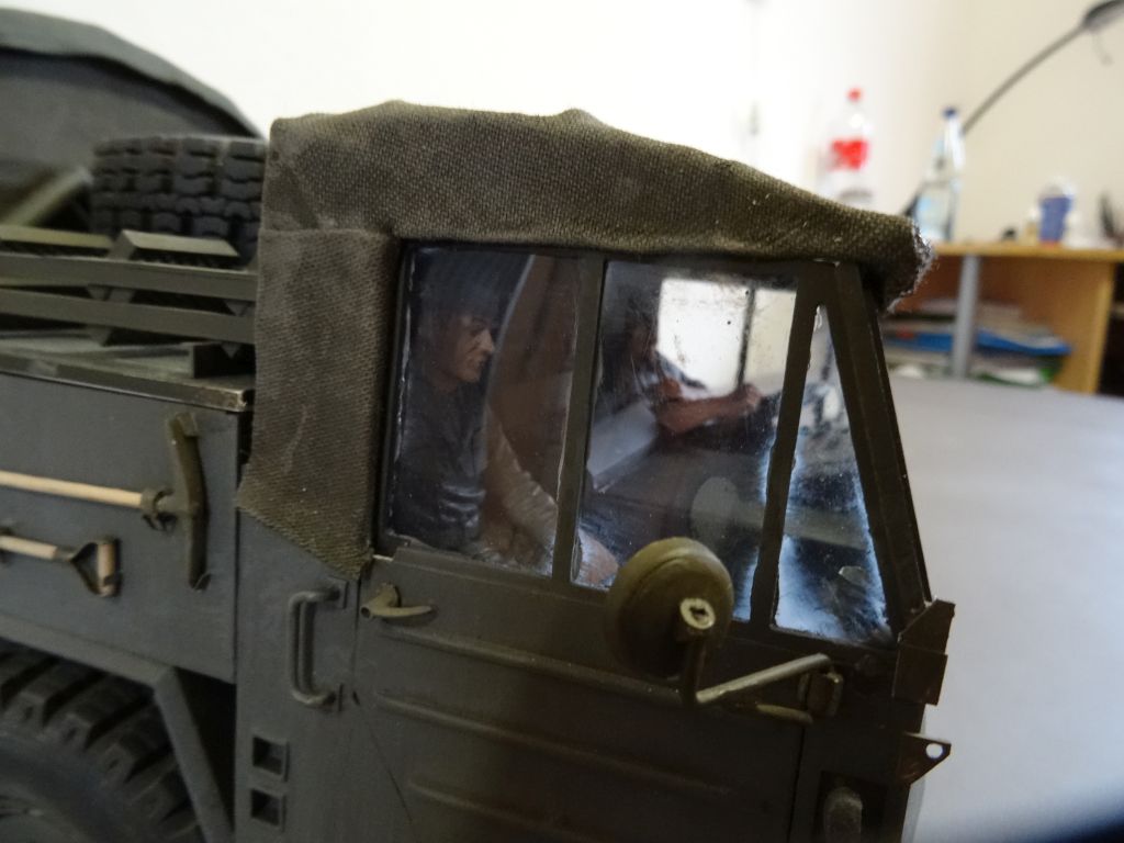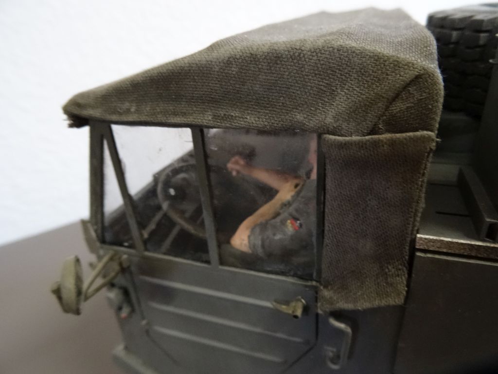 Die Plane für das Fahrerhaus und die Pritsche sind aus Stoff von einem Bundeswehrhemd , der entsprechend zurechtgeschnitten wurde und an den Kanten mit TESA Alleskleber verklebt wurde .