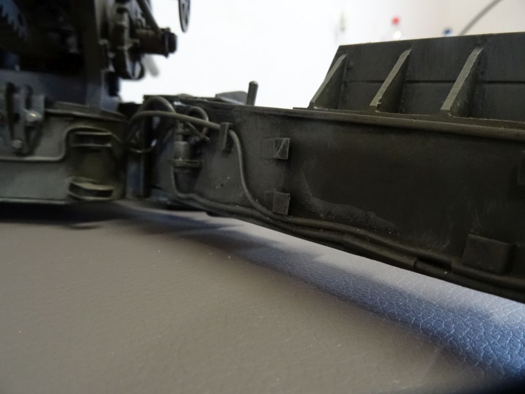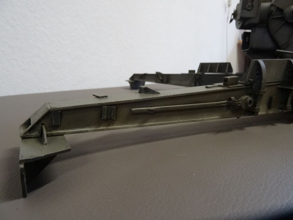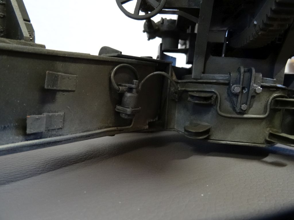 der gleiche Holm von der Innenseite vorne sind die Luftfilter für die Druckluftversorgung der Bremse an jedem Holm erkennbar , die Druckluftleitungen wurden von den Filtern durch die Unterlafette zu den Bremszylindern geleitet ( das sind dann die Leitungen , die man auf den Bildern vom Fahrgestell an den Bremszylindern sehen kann ) . Die Haken , die man an der Unterlafette erkennen kann sind die Befestigungspunkte für die vorderen Erdsporne. Die beiden äußeren Befestigungspunkte sind die Haken an der Außenseite der Lafette.