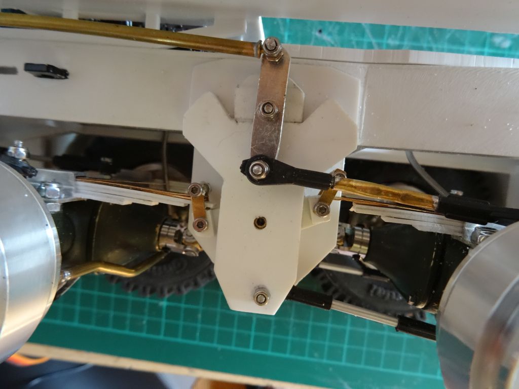 Ebenso wurde die original Lenkung des Faun´s mit den Umlenkhebeln und dem Lenkstock nachgebaut , dies geschah allerdings mit Messing und Alu .