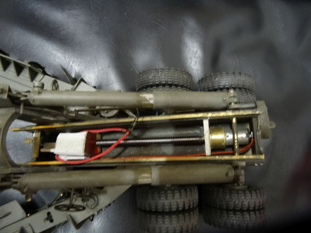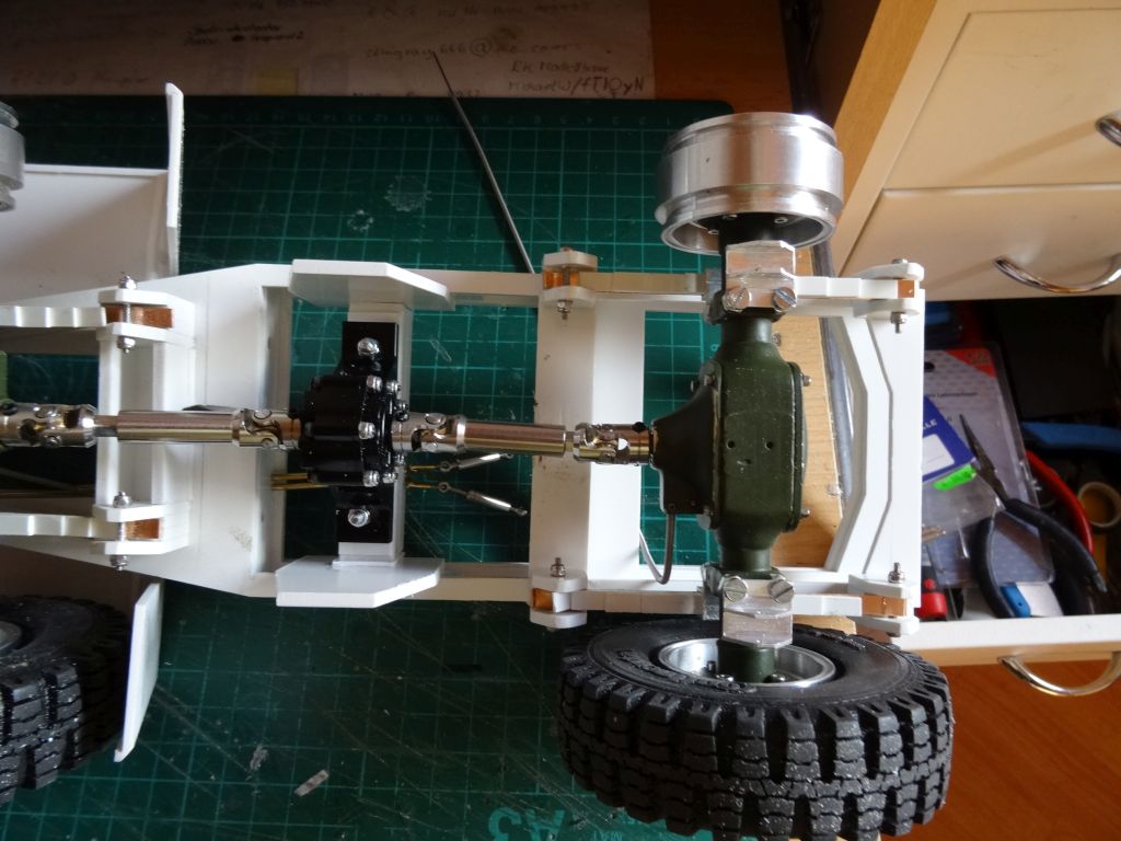 Als Motor dient ein Truckpuller 12 Volt , das Getriebe ist ein 3 Gang Schaltgetriebe von Lesu und das Verteilergetriebe stammt ebenfalls von Lesu ( erhältlich auch als Ticon Kompenenten )