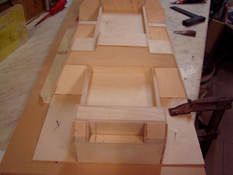 Ich liebe so ziemlich alle Materialien, bin aber begeisterter Holzwurm. Wanne ist aus 3 mm Birkensperrholz. Die Basis auf eine Helling genagelt, Maße des Revell-Modells abgenommen, und Stück für Stück rangebastelt.