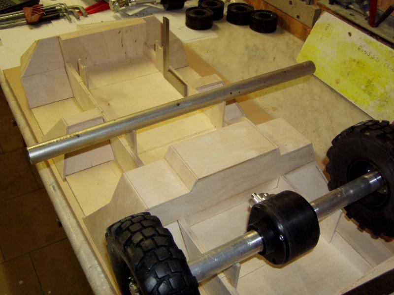 Die Wanne ist noch auf die Helling genagelt, nun muß ich die Position der 3 Achsen definieren. Habe mittels Hilfshölzchen und Alurohren dieses bewerkstelligt.