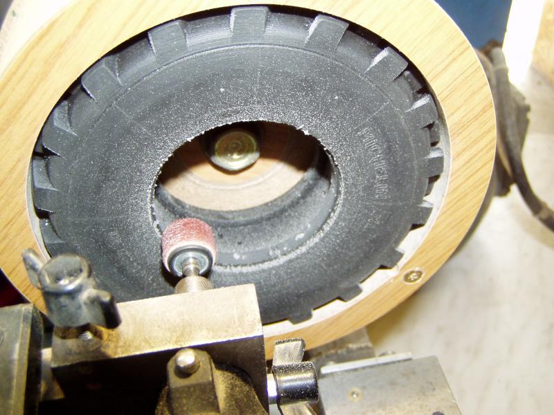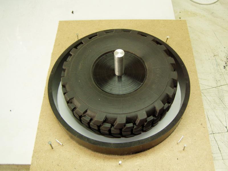 Fertig in dem Unterteil zur Abformung. Aussen einen elastischen Formring, Reifen etwas erhöht auf Drehteil, wird ausgegossen mit Kerzenwachs.