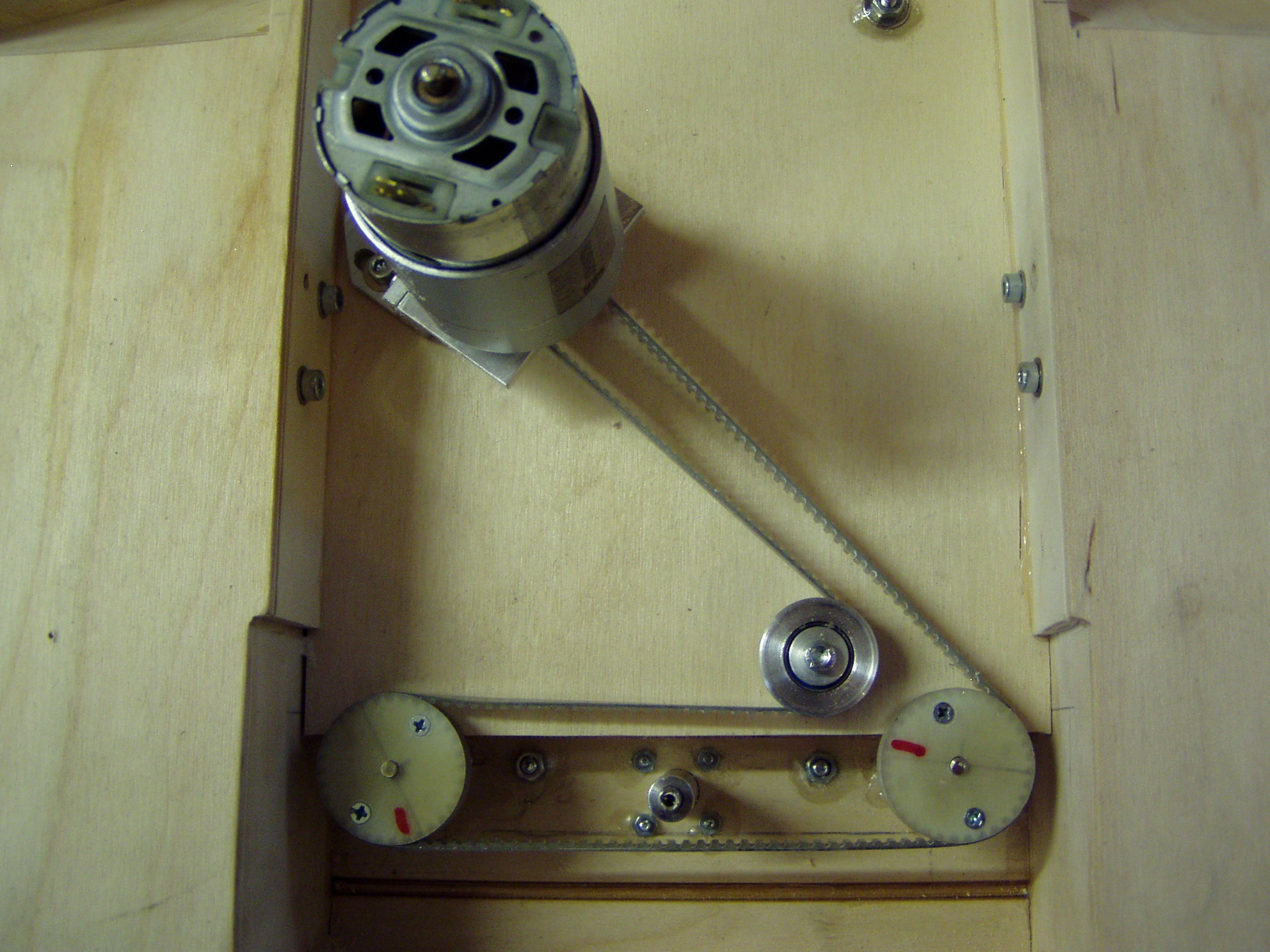 Antrieb der Propeller. Der vorhandene Riemen war etwas lang, deswegen die Umlenkrolle. Hat aber den Vorteil eines möglichst großen Umschlingungswinkels an den Scheiben.