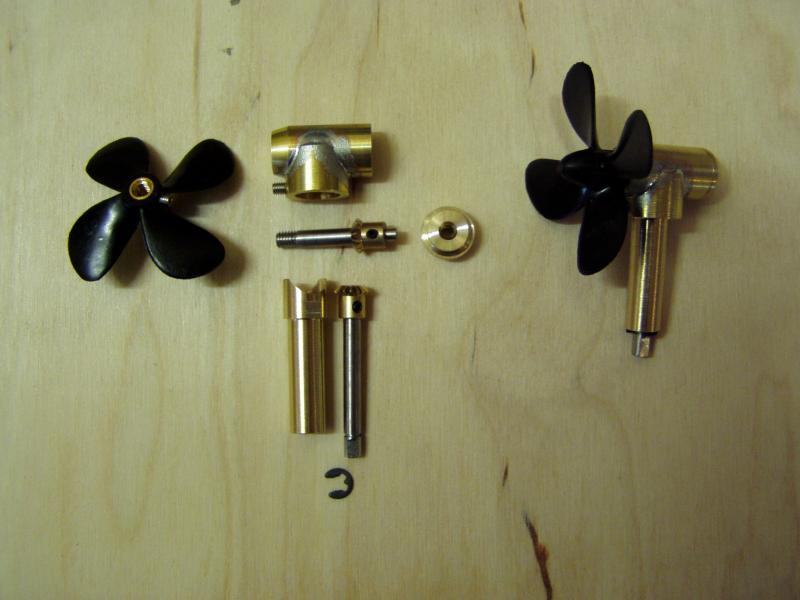 Als Nächstes widmete ich mich dem Schottelantrieb. 2 Kegelzahnräder Modul 0,5, 2 Vierblattpropeller Graupner, 45 mm Durchmesser, ein paar Drehteile aus Messing und V2A.