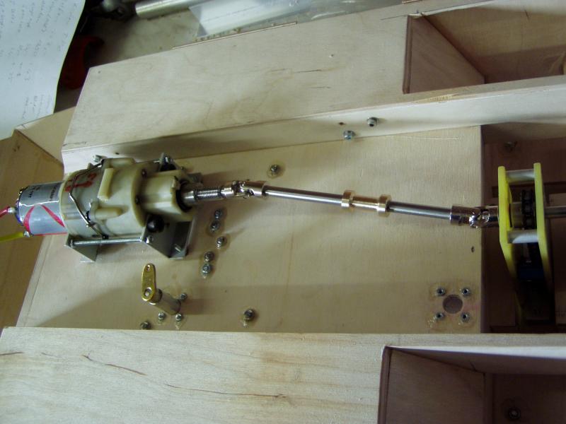 Vom Tunnel führt ein Kettentrieb nach oben, hier links noch der ursprüngliche Motor zu sehen. 2-Gang-Akkuschraubergetriebe,