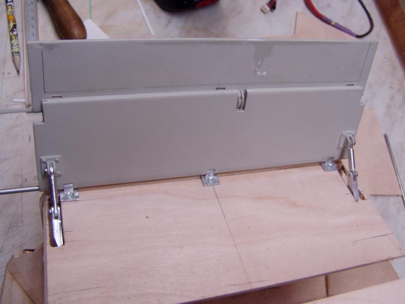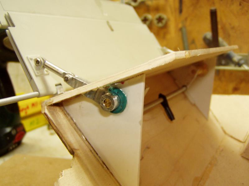 Geschlossen gehalten wird das Schwallbrett durch einen 0,5 mm Stahldraht, er dient als Torsionsfeder. Beim Ausfahren nutze ich die Umlenkrolle und ein Stück Angelsehne, damit das obere Teil mit ausfährt/klappt.