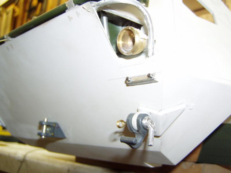 Blick von vorn links. Scheinwerfer aus Messing gedreht, könnten 2 mm mehr Durchmesser haben. Aber kein Rohmaterial vorhanden. Mittlere Schleppöse und T-Zughaken, gefräst/gefeilt aus PVC. Sicherungssplint aus 0,8 mm Messingdraht.