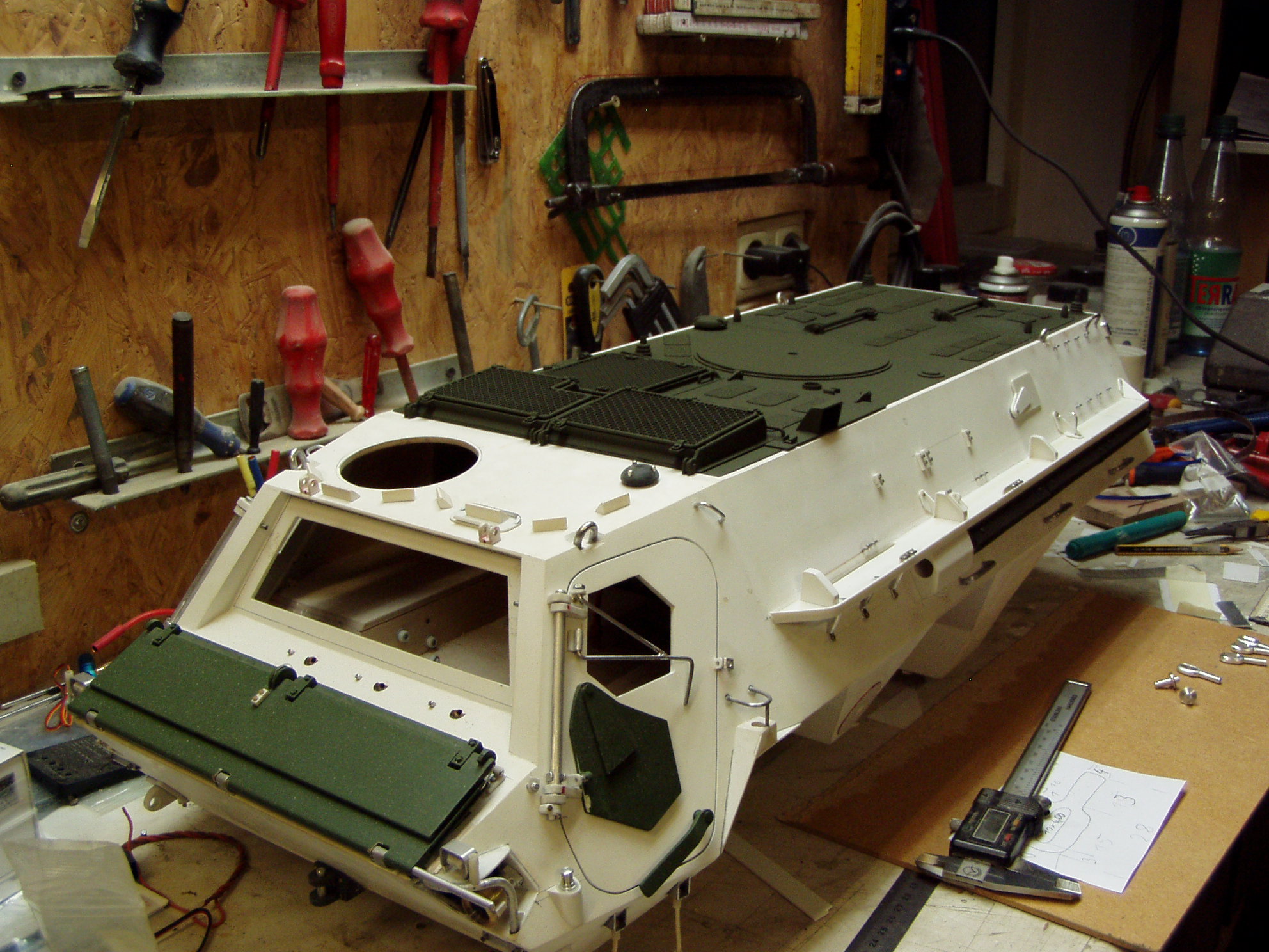 Kommandantenluke, weis zwar nicht, ob der SAN eine MG-Halterung hat, ist eben künstlerische Freiheit. Im Hintergrund mein neues Getriebe. Habe den Akkuschrauberantrieb verworfen, hier werkelt ein 70-Watt BL-Aussenläufer, Getriebe Modul 1, Untersetzung 5:1. Zahnräder vom Mädler, bearbeitet und gehärtet. Gesammtuntersetzung nun 15:1. -- Ein Tag ohne Modellbau ist ein Verlorener...