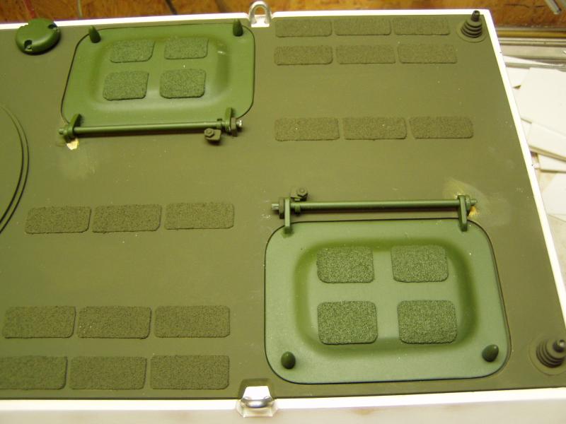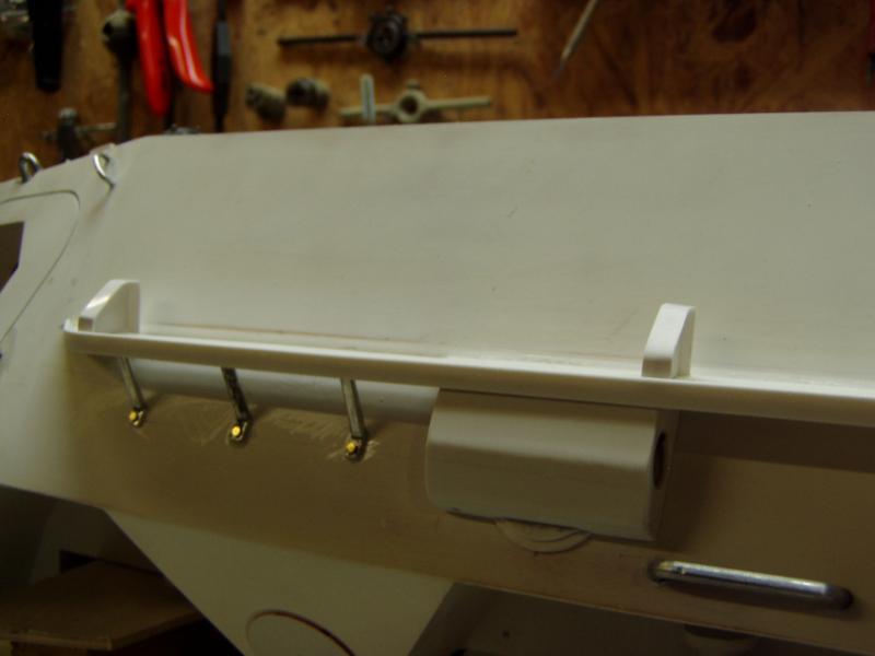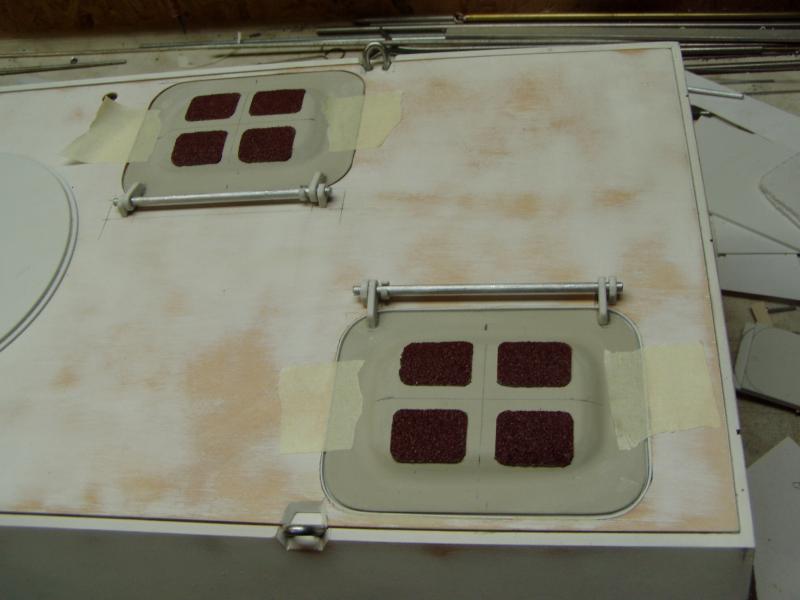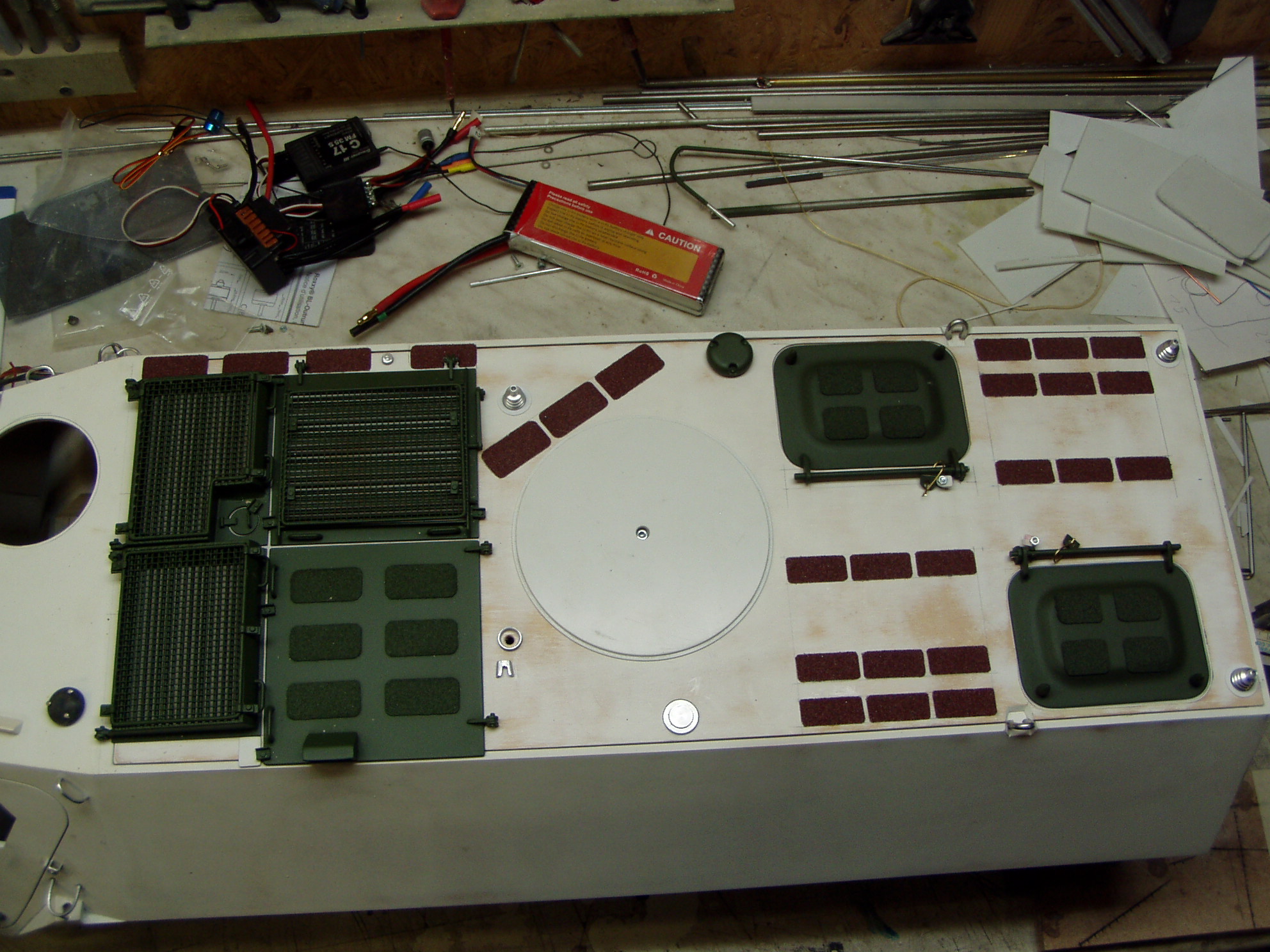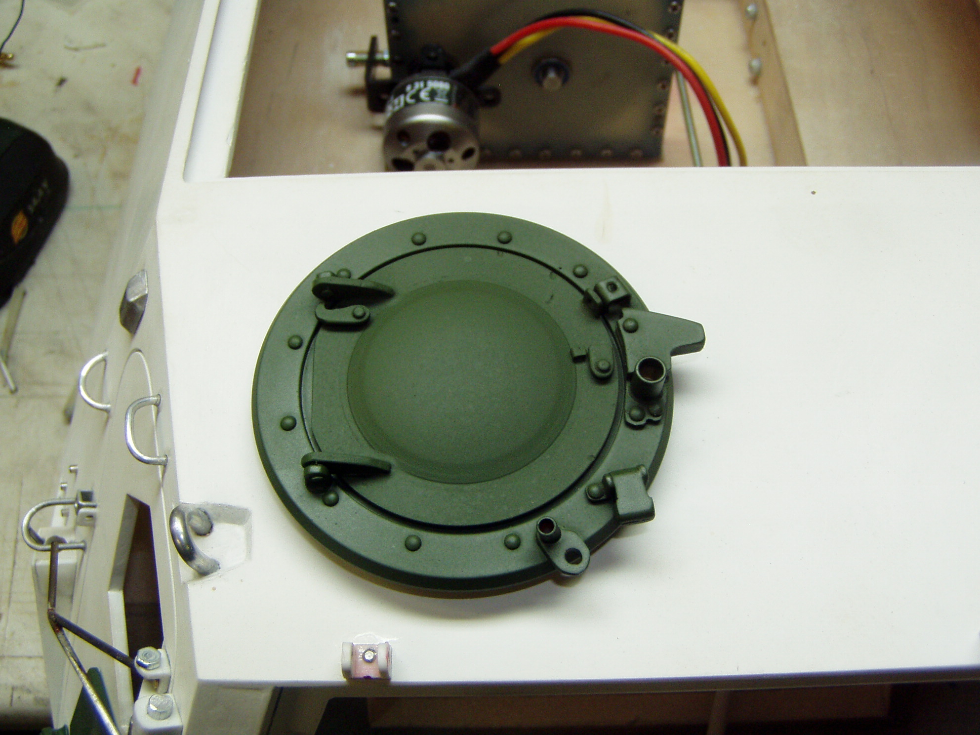 Oberteil noch teillackiert. Die Antennensockel aus Alu gedreht. Mittig der zugeschweissten Luke das einzig unschöne Teil, die Verschlussschraube M3. Da der Deckel auch aus Sperrholz besteht, wölbt er sich leicht nach oben. Die Schraube zieht ihn bündig fest. -- Ein Tag ohne Modellbau ist ein Verlorener...