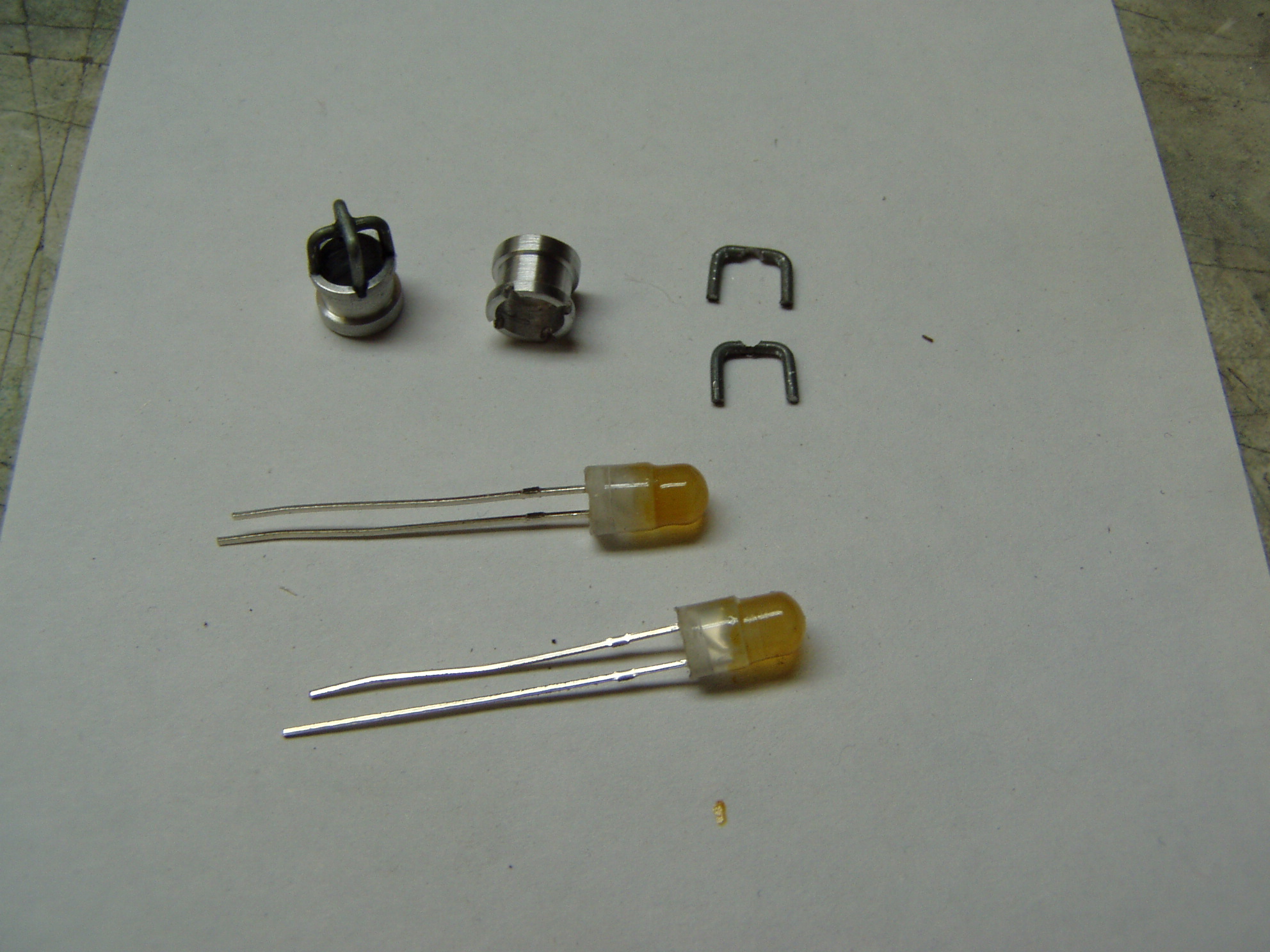 Die Seitenblinker in Entstehung. Aludrehteil, abgedrehte und mit Revell klar Orange lackierte LED, Schutzbügel.